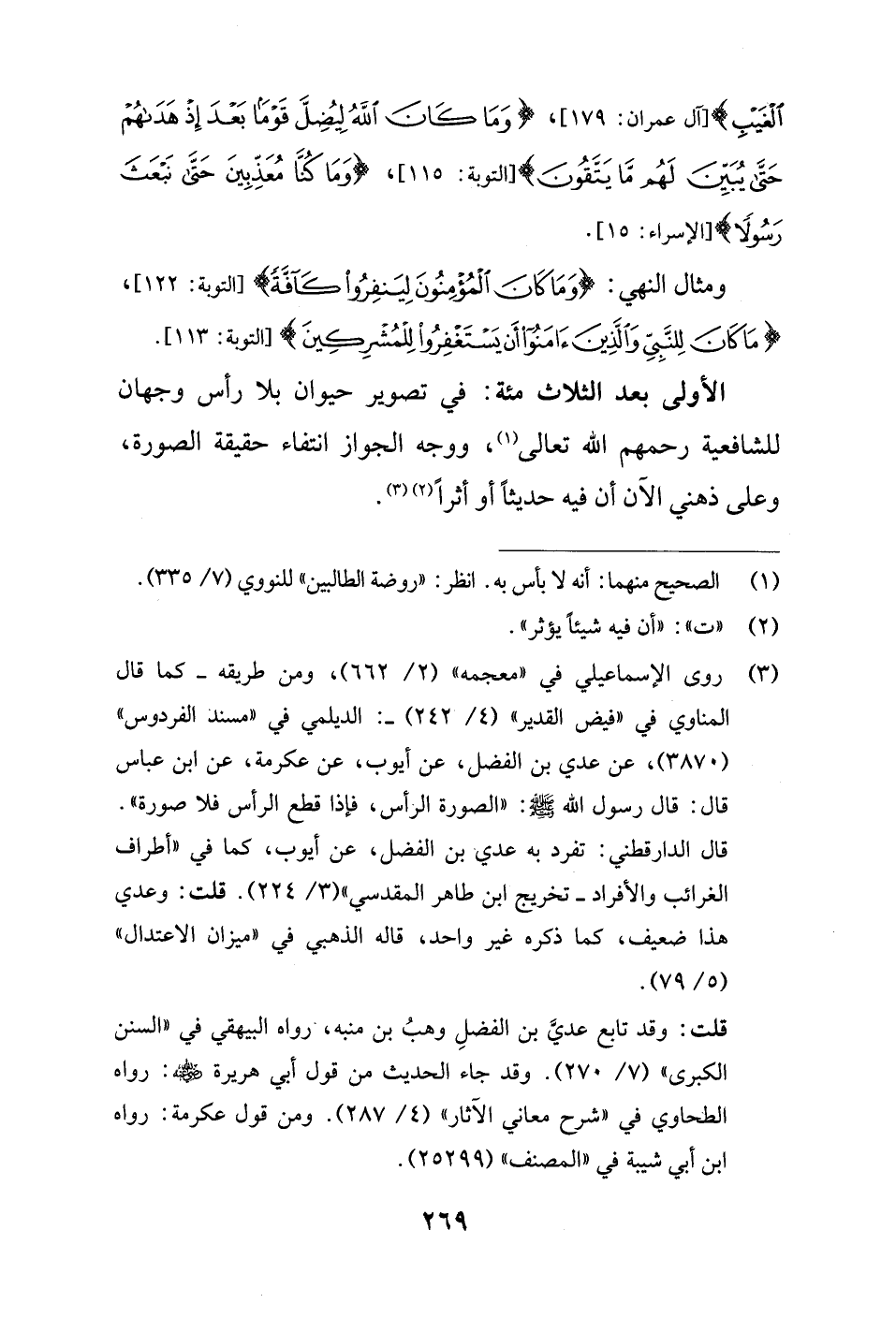 الأولى بعد الثلاث مئة: في تصوير حيوان بلا رأس وجهان للشافعية رحمهم الله تعالى (¬1)، ووجه الجواز انتفاء حقيقة الصورة، وعلى ذهني الآن أن فيه حديثًا أو أثرًا (¬2) (¬3).