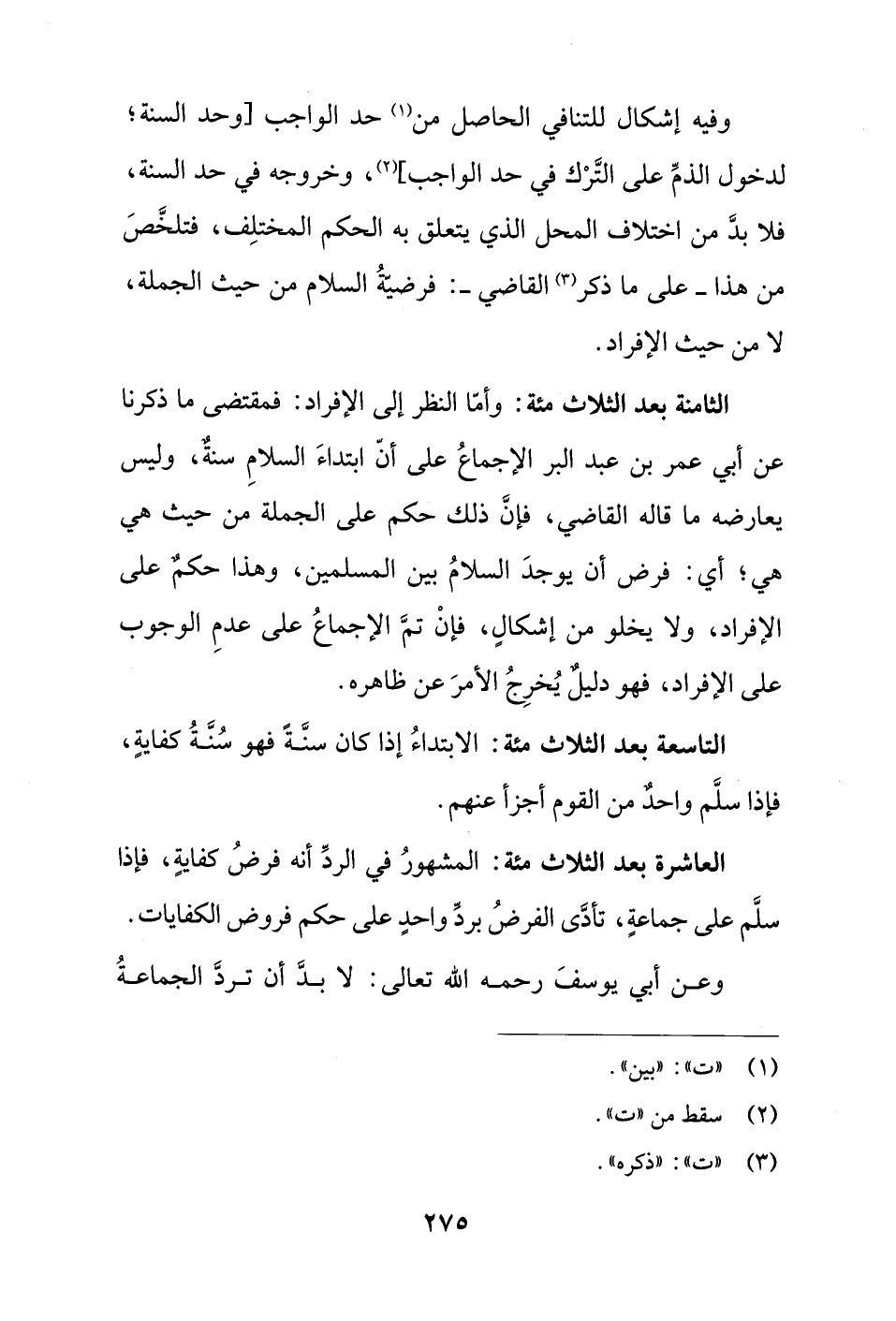 الثامنة بعد الثلاث مئة: وأمّا النظر إلى الإفراد: فمقتضى ما ذكرنا عن أبي عمر بن عبد البر الإجماعُ على أنّ ابتداءَ السلامِ سنةٌ، وليس يعارضه ما قاله القاضي، فإنَّ ذلك حكم على الجملة من حيث هي هي؛ أي: فرض أن يوجدَ السلامُ بين المسلمين، وهذا حكمٌ على الإفراد، ولا يخلو من إشكالٍ، فإنْ تمَّ الإجماعُ على عدمِ الوجوب على الإفراد، فهو دليلٌ يُخرِجُ الأمرَ عن ظاهره.