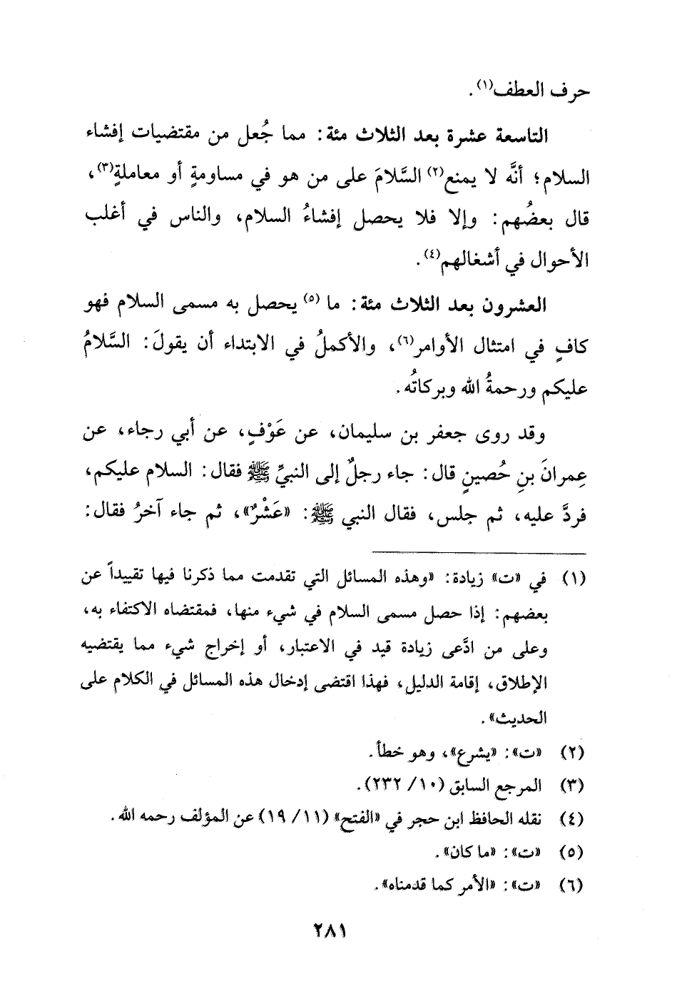 التاسعة عشرة بعد الثلاث مئة: مما جُعل من مقتضيات إفشاء السلام؛ أنَّه لا يمنع (¬2) السَّلامَ على من هو في مساومةٍ أو معاملةٍ (¬3)، قال بعضُهم: وإلا فلا يحصل إفشاءُ السلام، والناس في أغلب الأحوال في أشغالهم (¬4).