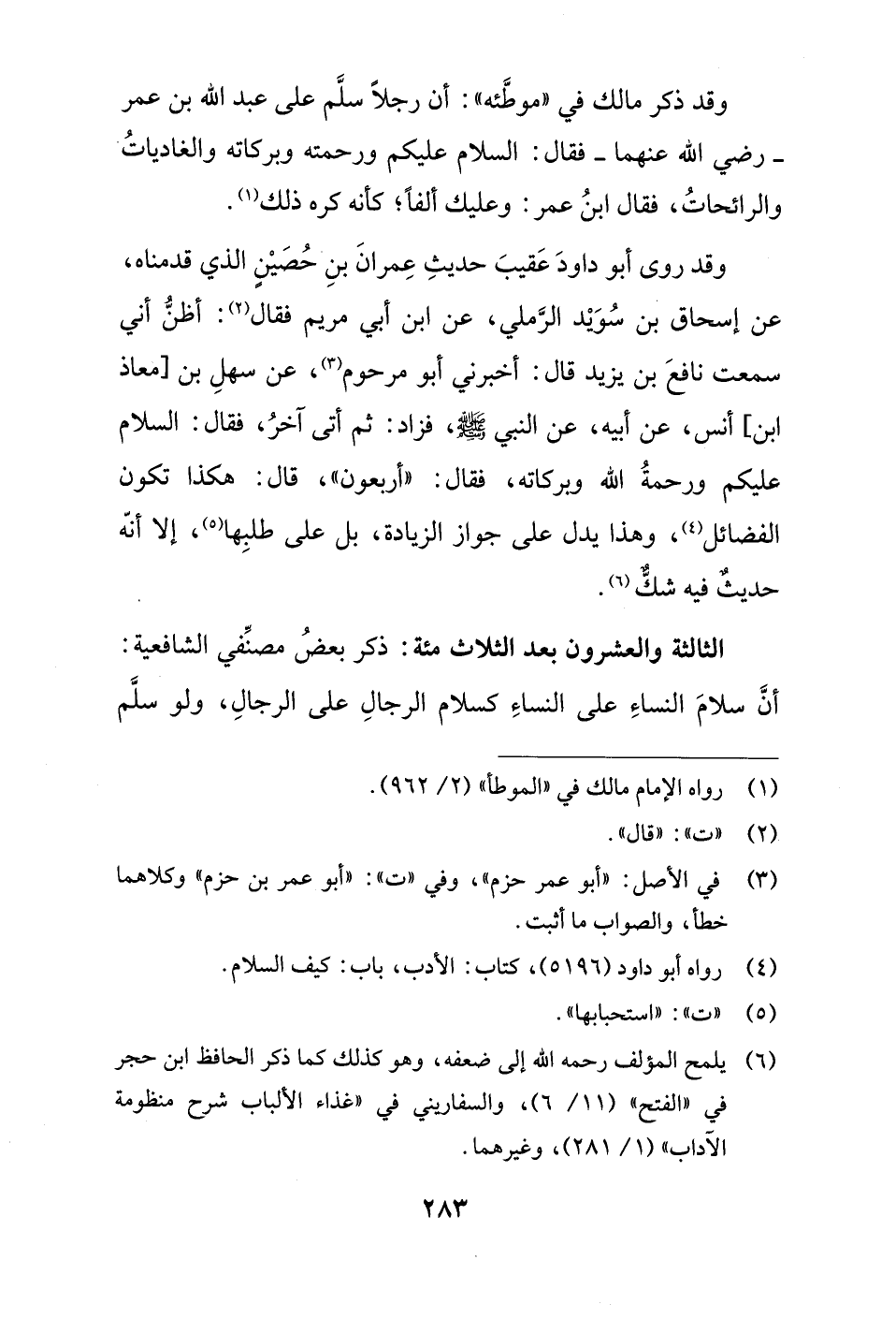 الثالثة والعشرون بعد الثلاث مئة: ذكر بعضُ مصنِّفي الشافعية: أنَّ سلامَ النساءِ على النساءِ كسلام الرجالِ على الرجالِ، ولو سلَّم
