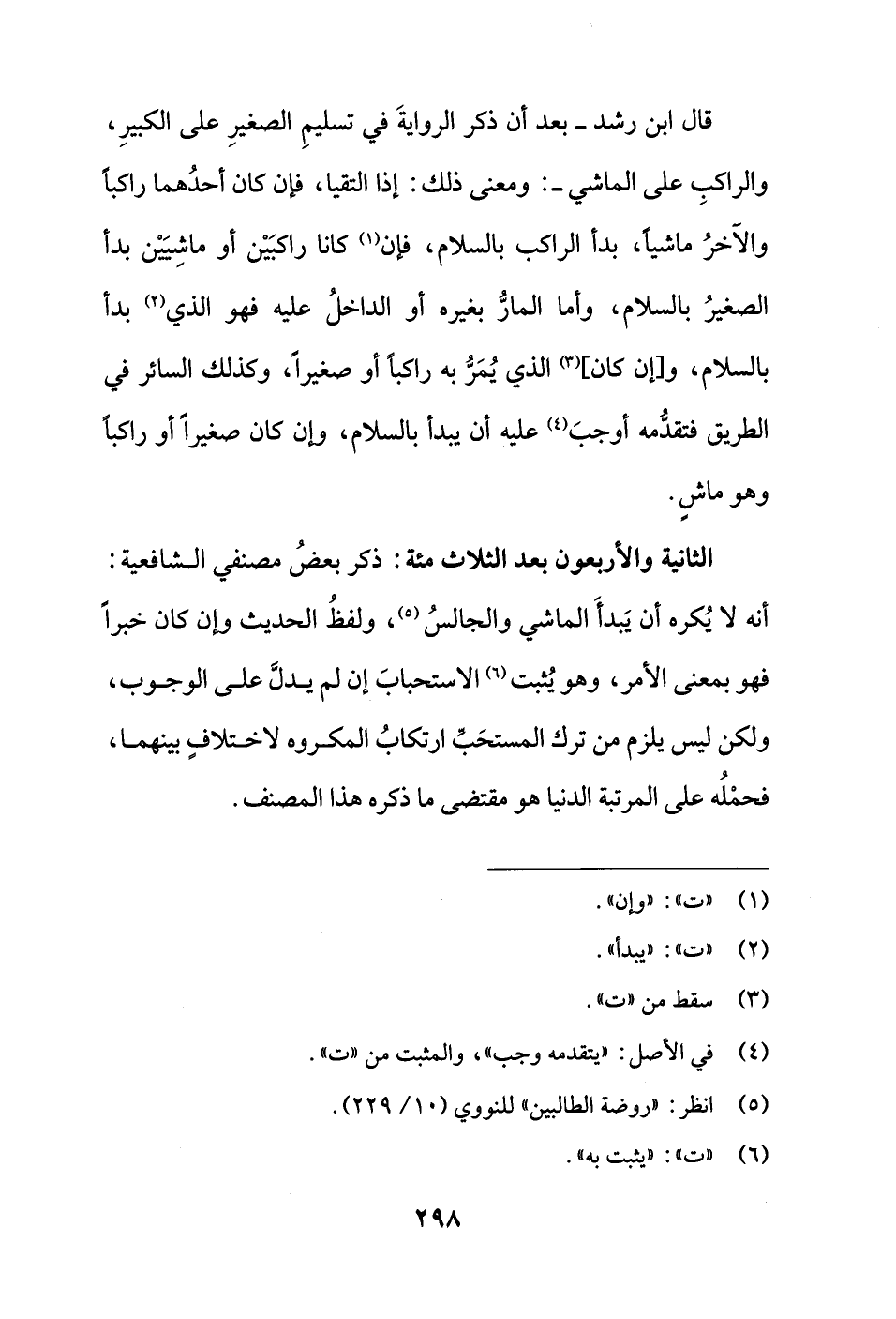قال ابن رشد - بعد أن ذكر الروايةَ في تسليمِ الصغيرِ على الكبيرِ، والراكبِ على الماشي -: ومعنى ذلك: إذا التقيا، فإن كان أحدُهما راكبًا والآخرُ ماشيًا، بدأ الراكب بالسلام، فإن (¬1) كانا راكبَيْن أو ماشِيَيْن بدأ الصغيرُ بالسلام، وأما المارُّ بغيره أو الداخلُ عليه فهو الذي (¬2) بدأ بالسلام، و [إن كان] (¬3) الذي يُمَرُّ به راكبًا أو صغيرًا، وكذلك السائر في الطريق فتقدُّمه أوجبَ (¬4) عليه أن يبدأ بالسلام، وإن كان صغيرًا أو راكبًا وهو ماشٍ.