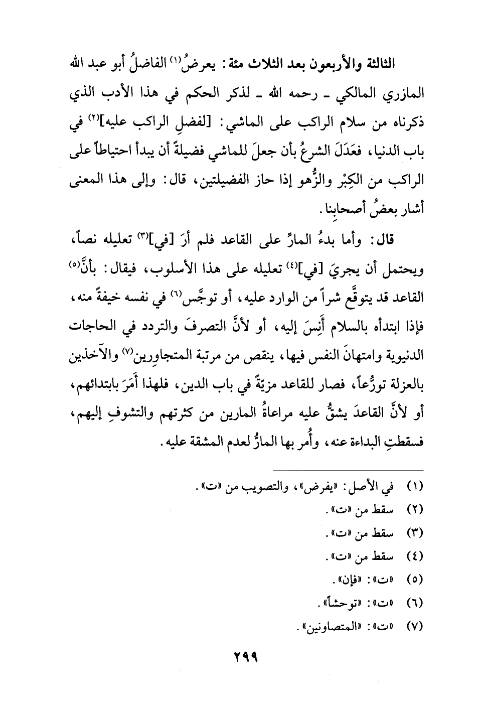 الثالثة والأربعون بعد الثلاث مئة: يعرضُ (¬1) الفاضلُ أبو عبد الله المازري المالكي - رحمه الله - لذكر الحكم في هذا الأدب الذي ذكرناه من سلام الراكب على الماشي: [لفضلِ الراكب عليه] (¬2) في باب الدنيا، فعَدَلَ الشرعُ بأن جعلَ للماشي فضيلةً أن يبدأ احتياطًا على الراكب من الكِبْر والزُّهو إذا حاز الفضيلتين، قال: وإلى هذا المعنى أشار بعضُ أصحابِنا.