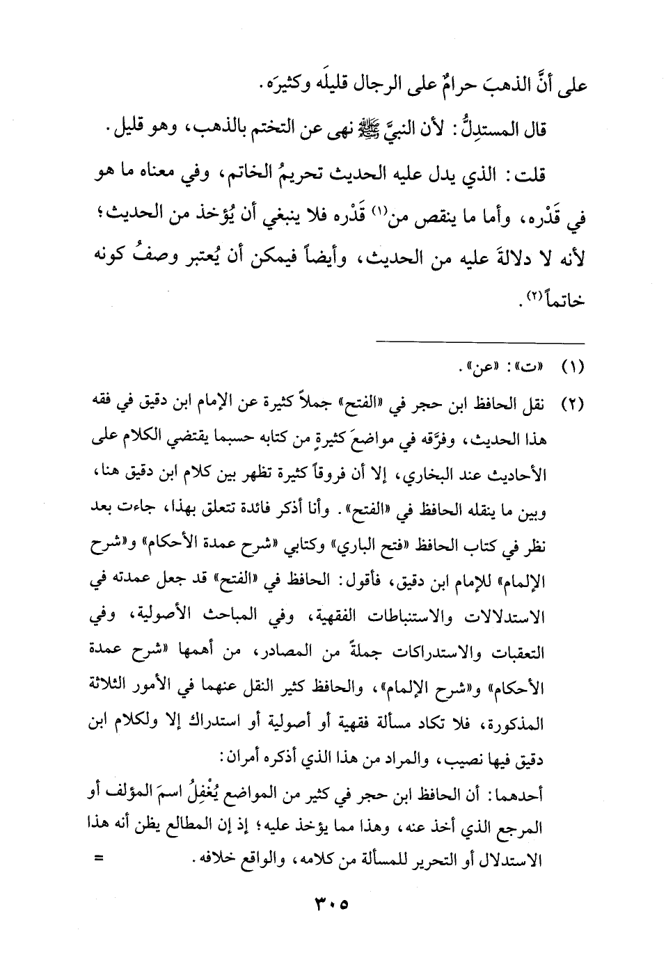 (¬2) نقل الحافظ ابن حجر في "الفتح" جملًا كثيرة عن الإمام ابن دقيق في فقه هذا الحديث، وفرَّقه في مواضعَ كثيرةٍ من كتابه حسبما يقتضي الكلام على الأحاديث عند البخاري، إلا أن فروقًا كثيرة تظهر بين كلام ابن دقيق هنا، وبين ما ينقله الحافظ في "الفتح". وأنا أذكر فائدة تتعلق بهذا، جاءت بعد نظر في كتاب الحافظ "فتح الباري" وكتابي "شرح عمدة الأحكام" و"شرح الإلمام" للإمام ابن دقيق، فأقول: الحافظ في "الفتح" قد جعل عمدته في الاستدلالات والاستنباطات الفقهية، وفي المباحث الأصولية، وفي التعقبات والاستدراكات جملةً من المصادر، من أهمها "شرح عمدة الأحكام" و"شرح الإلمام"، والحافظ كثير النقل عنهما في الأمور الثلاثة المذكورة، فلا تكاد مسألة فقهية أو أصولية أو استدراك إلا ولكلام ابن دقيق فيها نصيب، والمراد من هذا الَّذي أذكره أمران: