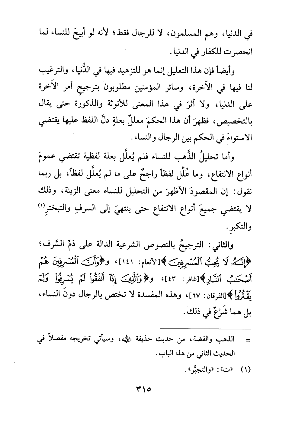 والثاني: الترجيحُ بالنصوص الشرعية الدالة على ذمِّ السَّرف؛ {إِنَّهُ لَا يُحِبُّ الْمُسْرِفِينَ} [الأنعام: 141]، {وَأَنَّ الْمُسْرِفِينَ هُمْ أَصْحَابُ النَّارِ} [غافر: 43]، {وَالَّذِينَ إِذَا أَنْفَقُوا لَمْ يُسْرِفُوا وَلَمْ يَقْتُرُوا} [الفرقان: 67] وهذه المفسدة لا تختص بالرجال دونَ النساء، بل هما شَرْعٌ في ذلك.
