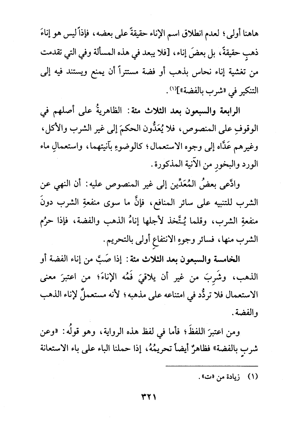 الرابعة والسبعون بعد الثلاث مئة: الظاهريةُ على أصلهم في الوقوفِ على المنصوص، فلا يُعَدُّون الحكمَ إلى غير الشرب والأكل، وغيرهم عَدَّاه إلى وجوه الاستعمال؛ كالوضوءِ بآنيتهما، واستعمالِ ماء الورد والبخورِ من الآنية المذكورة.