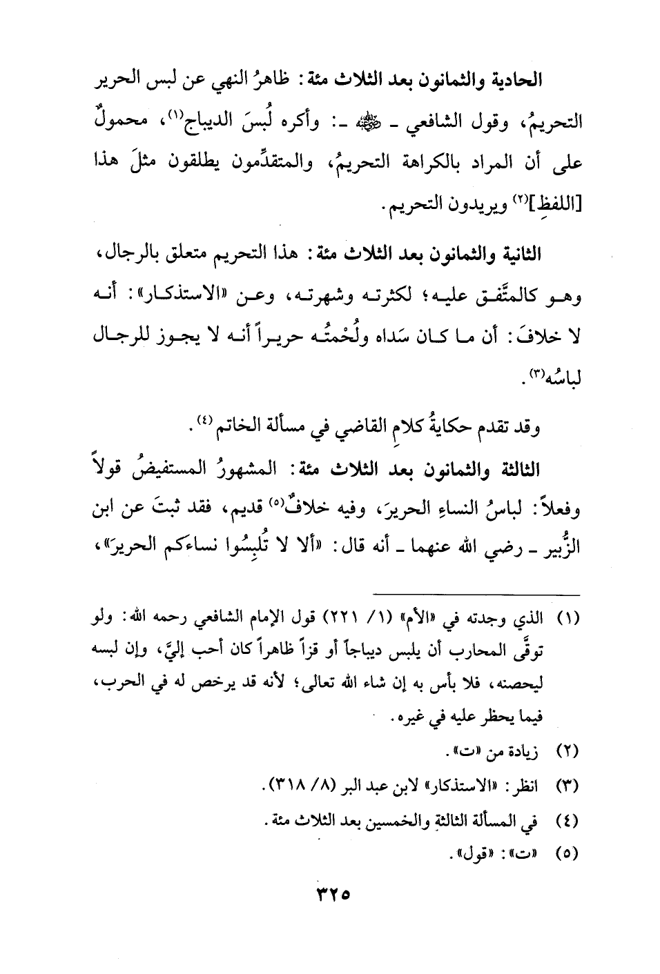 الثالثة والثمانون بعد الثلاث مئة: المشهورُ المستفيضُ قولًا وفعلًا: لباسُ النساءِ الحريرَ، وفيه خلافٌ (¬5) قديم، فقد ثبتَ عن ابن الزُّبير - رضي الله عنهما - أنه قال: "ألا لا تُلبِسُوا نساءَكم الحريرَ"،