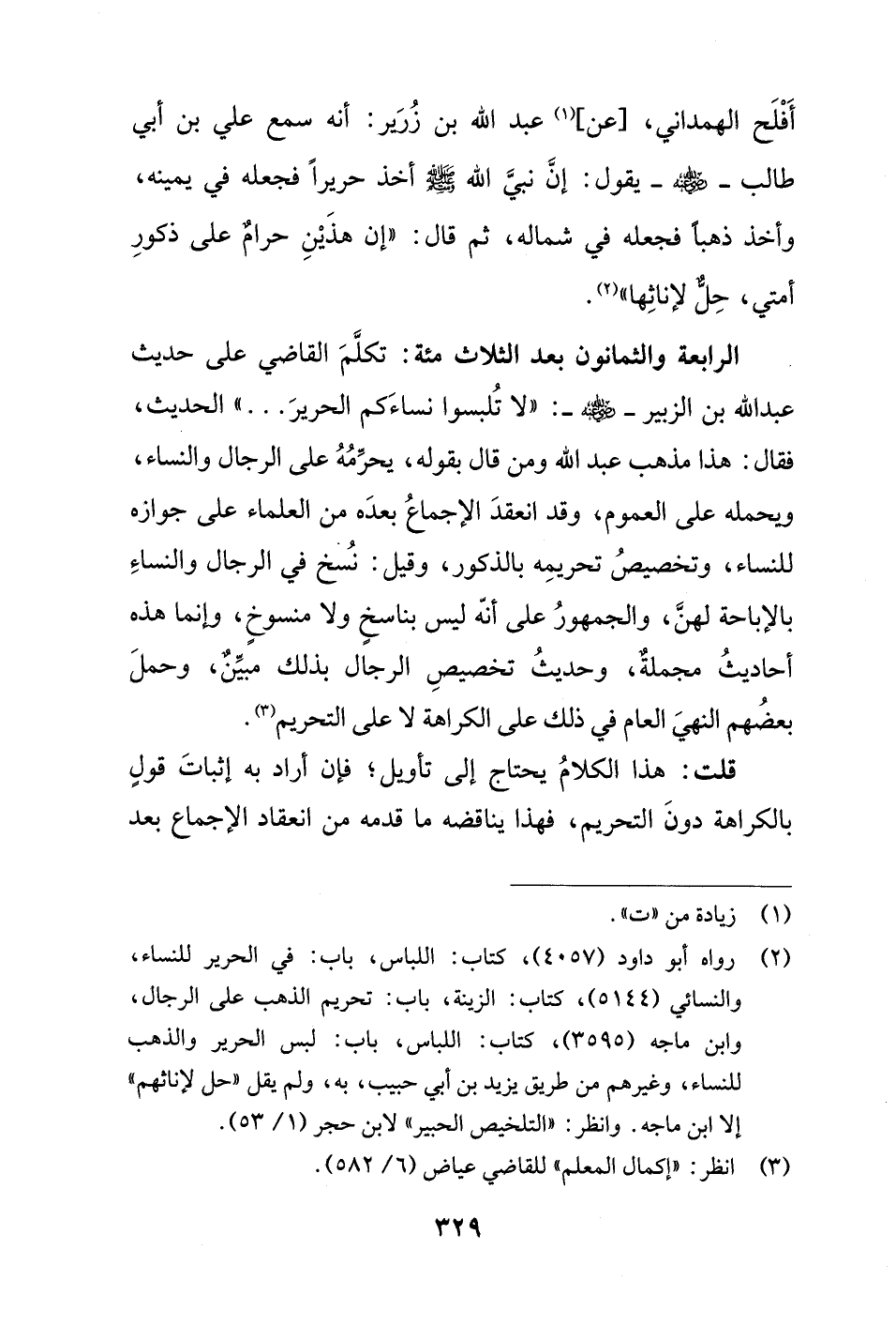 الرابعة والثمانون بعد الثلاث مئة: تكلَّمَ القاضي على حديث عبد الله بن الزبير - رضي الله عنه -: "لا تُلبسوا نساءَكم الحريرَ ... " الحديث، فقال: هذا مذهب عبد الله ومن قال بقوله، يحرِّمُهُ على الرجال والنساء، ويحمله على العموم، وقد انعقدَ الإجماعُ بعدَه من العلماء على جوازه للنساء، وتخصيصُ تحريمِه بالذكور، وقيل: نُسخ في الرجال والنساءِ بالإباحة لهنَّ، والجمهورُ على أنّه ليس بناسخٍ ولا منسوخٍ، وإنما هذه أحاديثُ مجملةٌ، وحديثُ تخصيصِ الرجال بذلك مبيِّنٌ، وحملَ بعضُهم النهىَ العام في ذلك على الكراهة لا على التحريم (¬3).
