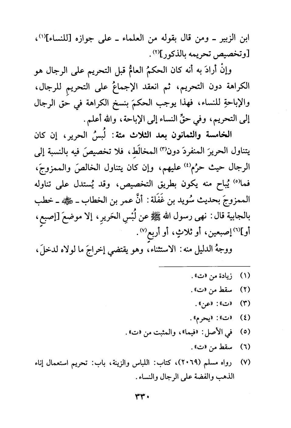 ابن الزبير - ومن قال بقوله من العلماء - على جوازه [للنساء] (¬1)، [وتخصيص تحريمه بالذكور] (¬2).