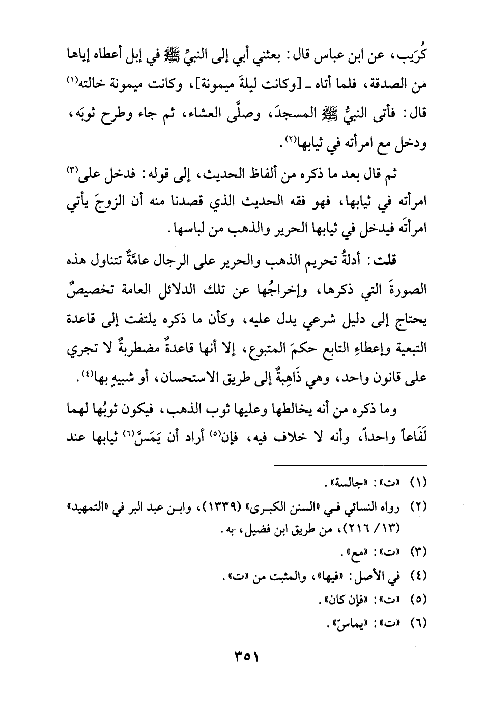 قلت: أدلةُ تحريم الذهب والحرير على الرجال عامَّةٌ تتناول هذه الصورةَ التي ذكرها، وإخراجُها عن تلك الدلائل العامة تخصيصٌ يحتاج إلى دليل شرعي يدل عليه، وكأن ما ذكره يلتفت إلى قاعدة التبعية وإعطاءِ التابع حكمَ المتبوع، إلا أنها قاعدةٌ مضطربةٌ لا تجري على قانون واحد، وهي ذَاهِبةٌ إلى طريق الاستحسان، أو شبيهٍ بها (¬4).