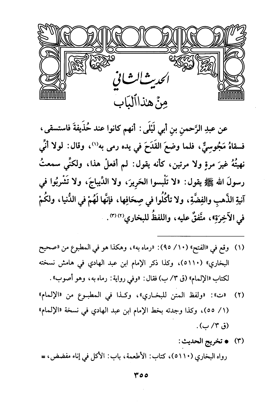 عن عبدِ الرَّحمنِ بنِ أبي لَيْلَى: أنهم كانوا عند حُذَيفةَ فاستسقى، فسقاهُ مَجُوسِيٌّ، فلما وضعَ القَدَحَ في يده رمى به (¬1)، وقال: لولا أنِّي نهيتُهُ غيرَ مرةٍ ولا مرتين، كأنه يقول: لم أفعلْ هذا، ولكنِّي سمعتُ رسولَ الله - صلى الله عليه وسلم - يقول: "لا تَلْبسوا الحَرِيرَ، ولا الدِّيباجَ، ولا تَشْربُوا في آنيةِ الذَّهبِ والفِضَّةِ، ولا تأكلُوا في صِحَافِها، فإنَّها لَهُمْ في الدُّنيا، ولكُمْ في الآخِرَةِ"، متَّفق عليه، واللفظُ للبخاري (¬2) (¬3).