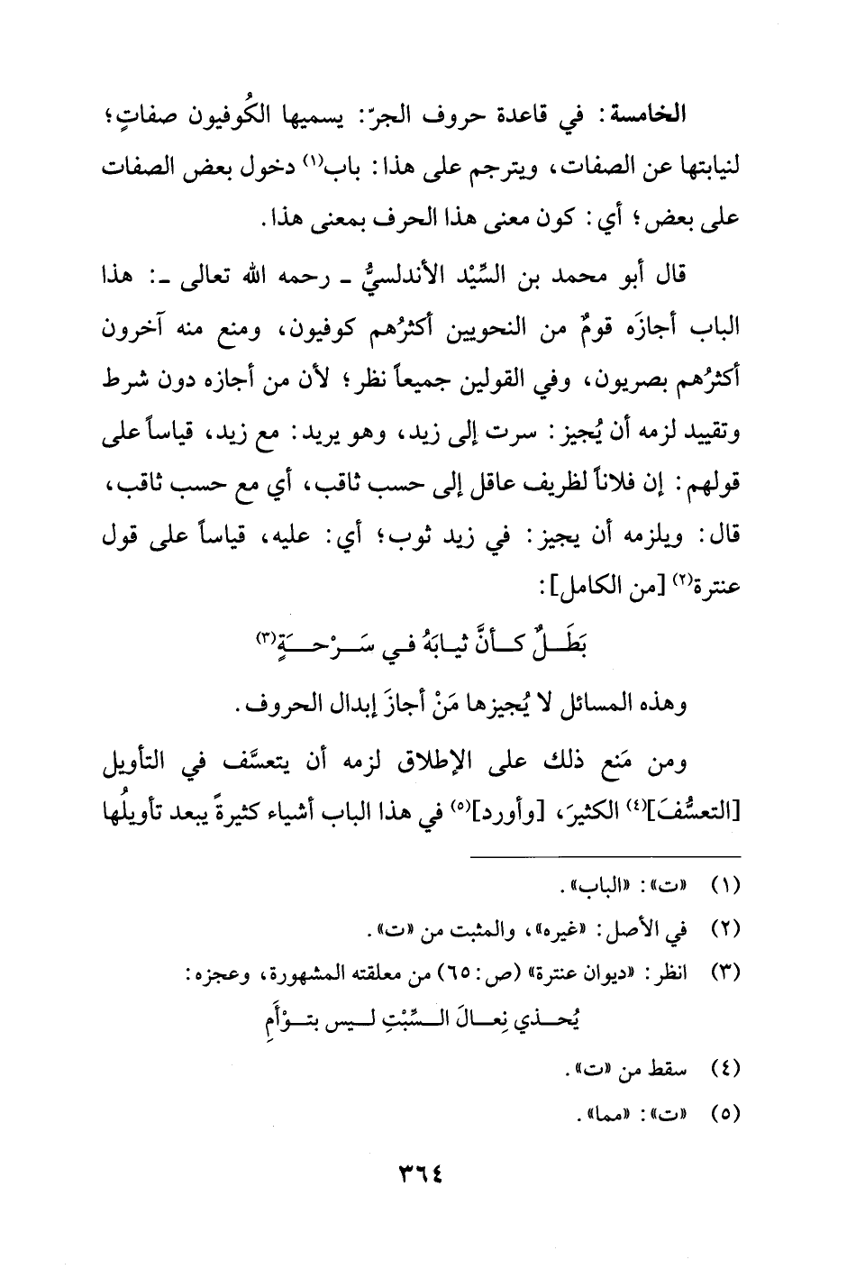 قال أبو محمد بن السِّيْد الأندلسيُّ - رحمه الله تعالى -: هذا الباب أجازَه قومٌ من النحويين أكثرُهم كوفيون، ومنع منه آخرون أكثرُهم بصريون، وفي القولين جميعًا نظر؛ لأن من أجازه دون شرط وتقييد لزمه أن يُجيز: سرت إلى زيد، وهو يريد: مع زيد، قياسًا على قولهم: إن فلانًا لظريف عاقل إلى حسب ثاقب، أي مع حسب ثاقب، قال: ويلزمه أن يجيز: في زيد ثوب؛ أي: عليه، قياسًا على قول عنترة (¬2) [من الكامل]: