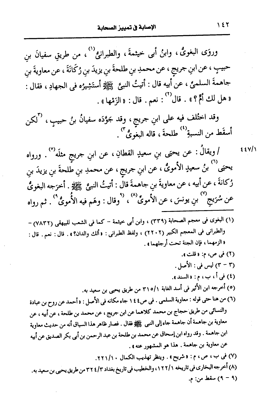 أَخرجه البغوي، عَن شريح بن يونس، عَن الأموي ثم رواه من طريق حجاج بن محمد، عَن ابن جريج فخالف في نسب محمد بن طلحة فقال، عَن محمد بن طلحة بن عَبد الله بن عبد الرحمن، عَن أَبيه طلحة، عَن معاوية بن جاهمة أن جاهمة جاء إِلَى النَّبِيِّ صَلى الله عَلَيه وسَلم فذكر الحديث.