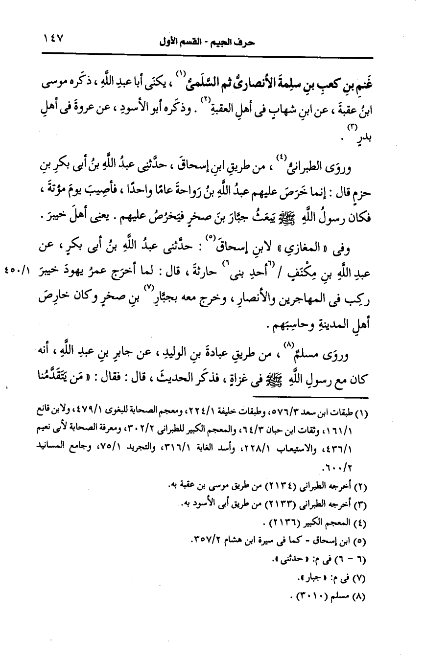 وروى مسلم من طريق عبادة بن الوليد، عَن جابر بن عَبد الله أنه كان مع رسول الله صَلى الله عَلَيه وسَلم في غزاة فذكر الحديث قال، فقال: من يتقدمنا فيمدر لنا الحوض ويشرب ويسقينا قال جابر فقلتُ: هذا رجل، فقال: من رجل مع جابر فقام جبار بن صخر فقال له أنا يا رسول الله الحديث.