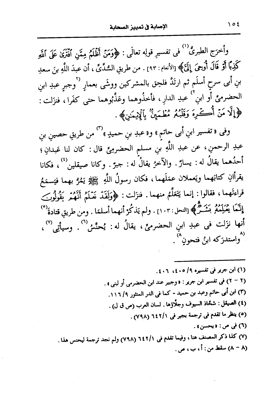 وأخرج الطَّبَرِي في تفسير قوله تعالى {ومن أظلم ممن افترى على الله كذبا أو قال أوحي إلي} من طريق السدي أن عَبد الله ابن سَعد بن أبي سرح أسلم ثم ارتد فلحق بالمشركين ووشى بعمار وجبر عبد بن الحضرمي أو بن عبد الدار فاخذوهما وعذبوهما حتى كفرا فنزلت الا من الحره وقبله مطمئن بالإيمان.