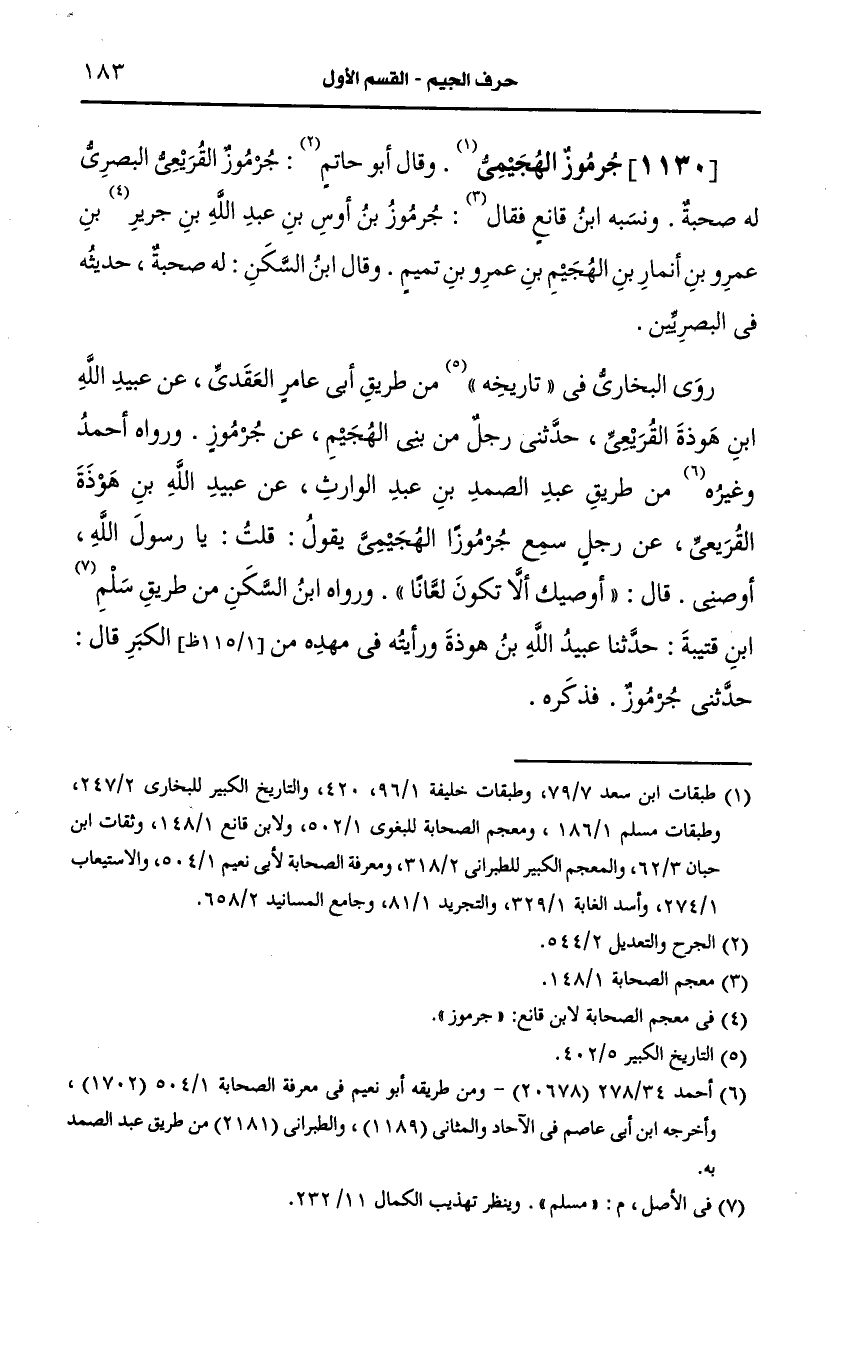 وقال ابن السَّكَن: له صُحبَةٌ حديثه في البصريين روى البُخارِيّ، في "تاريخه" من طريق أبي عامر العقدي، عَن عبيد الله بن هوذة القريعي حدثني رجل من بني الهجيم، عَن جرموز ووراه أَحمد وغيره من طريق عبد الصمد بن عبد الوارث، عَن عبيد الله بن هوذة، عَن رجل سمع جرموزا الهجيمي يقول قلت: يا رسول الله أوصني قال أوصيك ألا تكون لعانا ورواه ابن السَّكَن من طريق مسلم بن قتيبة، حَدَّثنا عبيد الله بن هوذة ورأيته في مهده من الكبر قال حدثني جرموز فذكره.