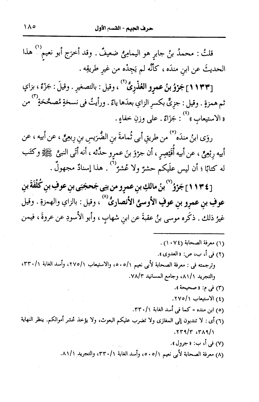 1133- جرو بن عَمرو العذري وقيل بالتصغير وقيل جزء بزاي ثم همزة وقيل جزي بكسر الزاي بعدها ياء ورأيت في نخسه صحيحة من الاستيعاب جزاء على وزن خفاء.