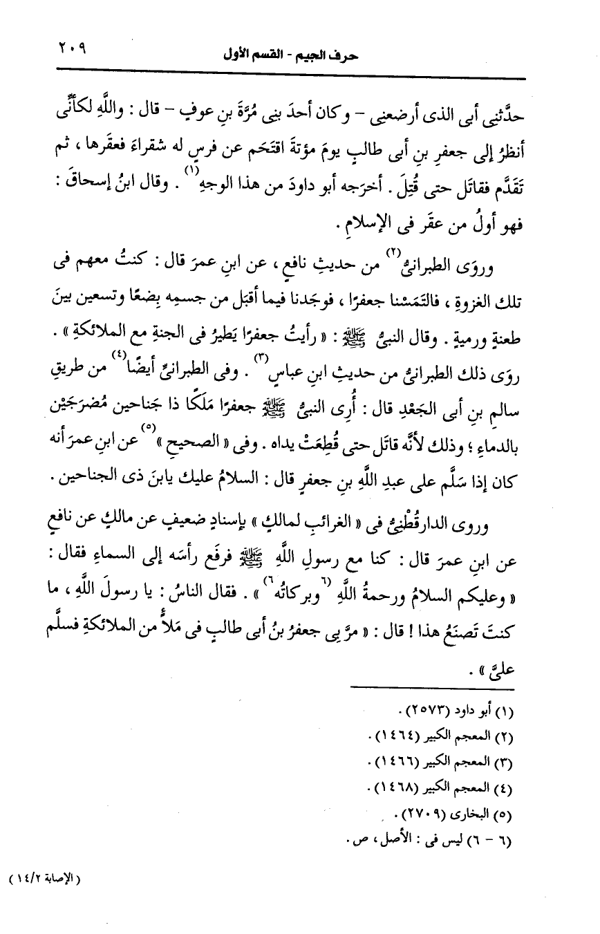 وروى الطَّبَرَانِيُّ من حديث نافع، عَن ابن عمر قال كنت معهم في تلك الغزوة فالتمسنا جعفرا فوجدنا فيما أقبل من جسمه بضعا وتسعين بين طعنة ورمية قال النَّبيّ صَلى الله عَلَيه وسَلم رأيت جعفرا يطير في الجنة مع الملائكة.