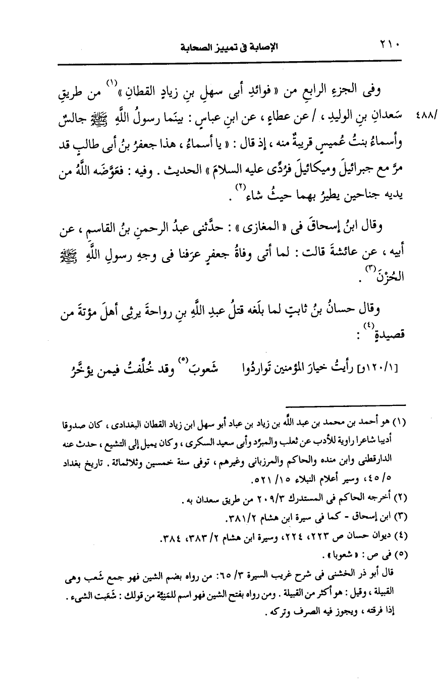 وفي الجزء الرابع من فوائد أبي سهل بن زياد القطان من طريق سعدان بن الوليد، عَن عطاء، عَن ابن عباس بينما رسول الله صَلى الله عَلَيه وسَلم جالس وأسماء بنت عميس قريبة منه إذ قال يا أسماء هذا جعفر بن أبي طالب قد مر مع جبرائيل وميكائيل فردي عليه السلام الحديث وفيه فعوضه الله من يديه جناحين يطير بهما حيث شاء.