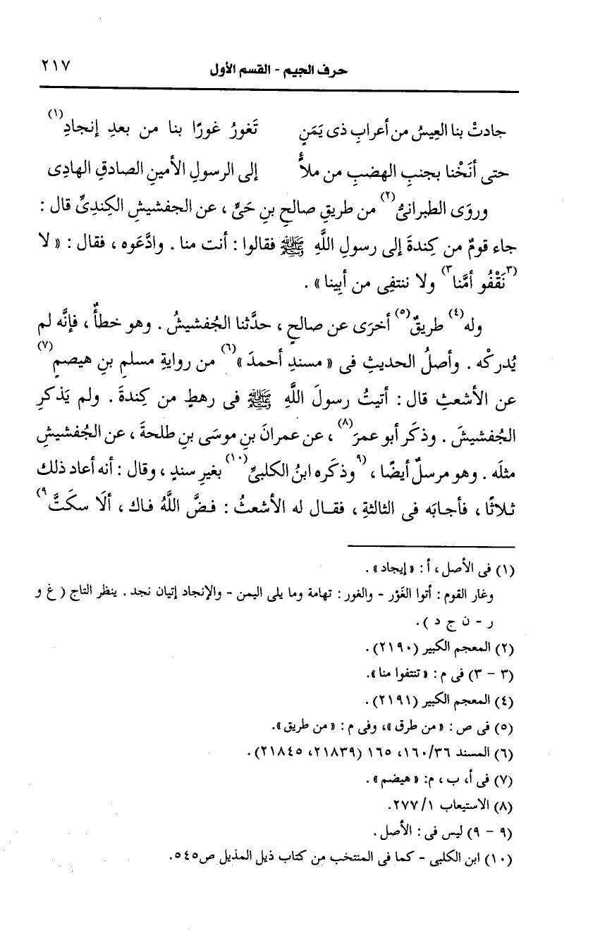 وأصل الحديث في مسند أَحمد من رواية مسلم بن هَيْصَم، عَن الأشعث، قال: أَتيتُ رسول الله صَلى الله عَلَيه وسَلم في رهط من كندة ولم يذكر الجفشيش وذكر أَبو عمر، عَن عمران بن موسى بن طلحة، عَن الجفشيش مثله وهو مرسل أيضًا.