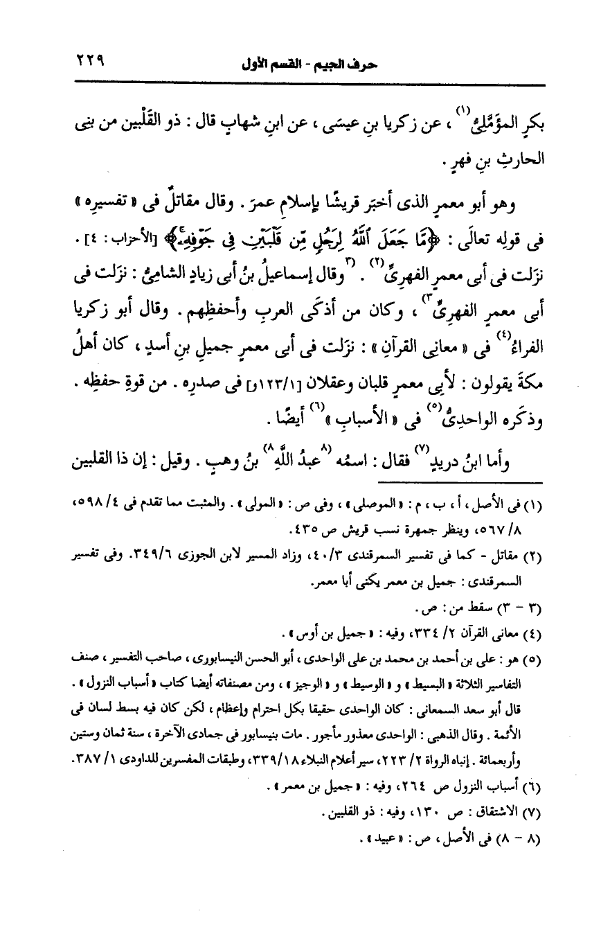 وقال مقاتل في تفسيره في قوله تعالى ما جعل الله لرجل من قلبين في جوفه نزلت في أبي معمر الفهري وكذا قال إسماعيل بن أبي زياد الشامي نزلت في أبي معمر الفهري، وكان من أذكى العرب وأحفظهم.