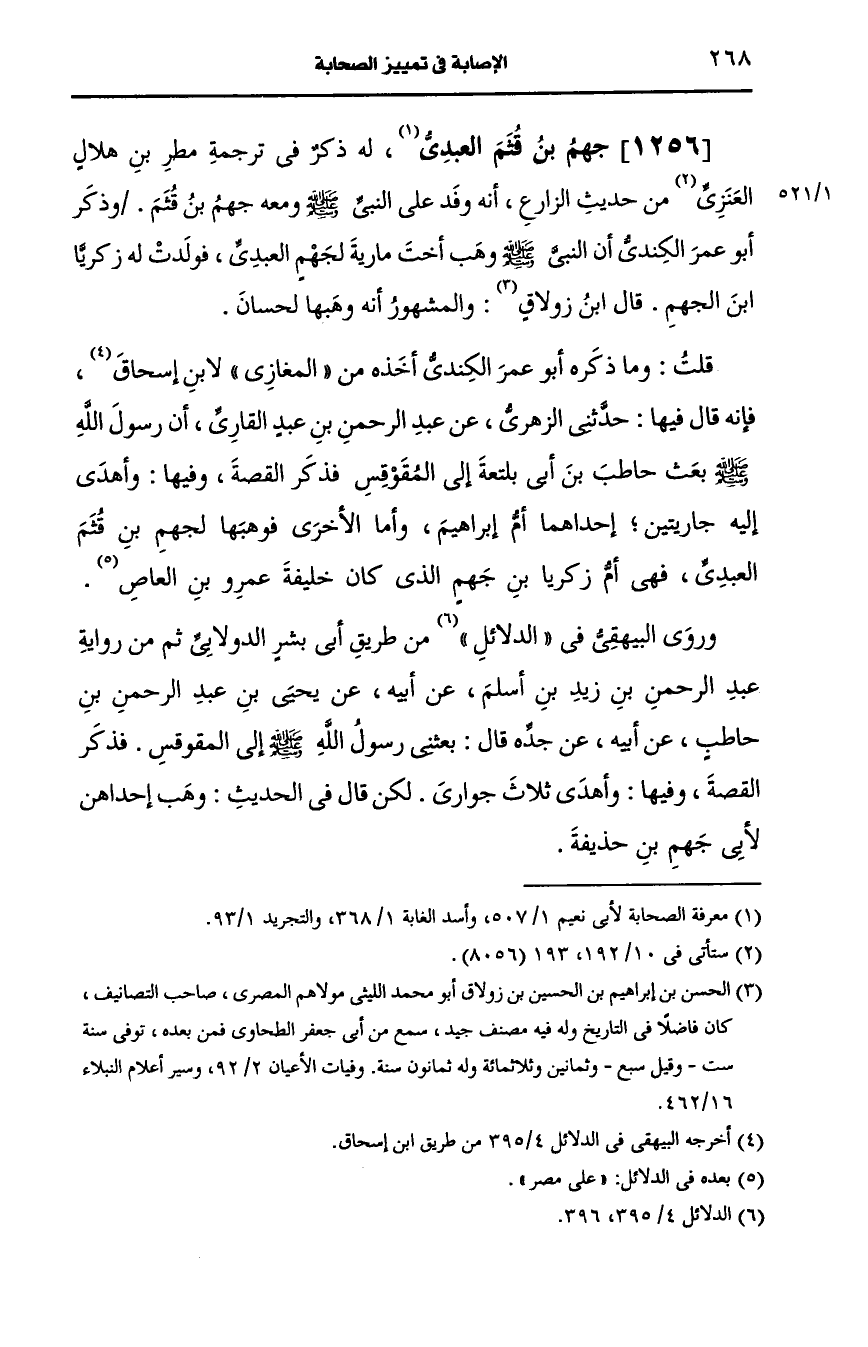 قلت: وما ذكره أَبو عمر الكندي أخذه من المغازي لابن إسحاق فإنه قال فيها حدثني الزُّهْرِيّ، عَن عبد الرحمن بن عبد القاري أن رسول الله صَلى الله عَلَيه وسَلم بعث حاطب بن أبي بلتعة إلى المقوقس فذكر القصة وفيها فأهدى إليه جاريتان إحداهما أم إبراهيم وأما الأخرى فوهبها لجهم بن قثم العبدي فهي أم زكريا بن جهم الذي كان خليفة عَمرو بن العاص.