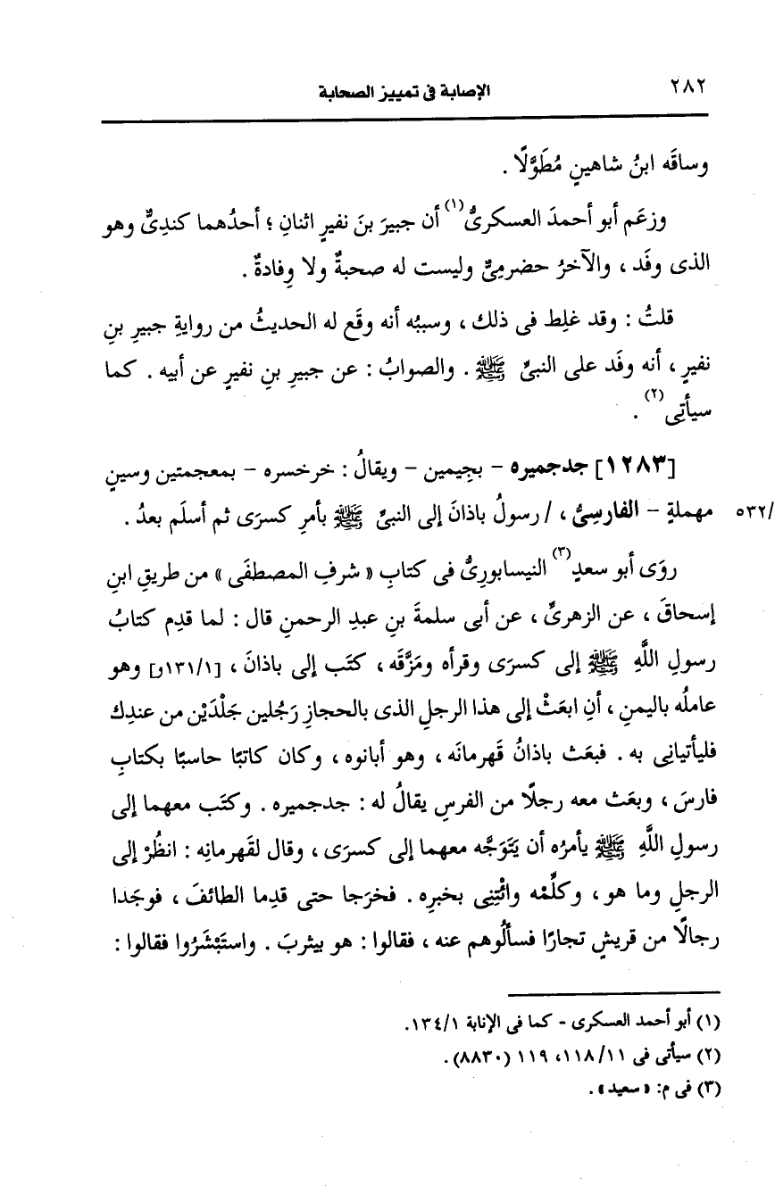 1283- (ز) جد جميرة بجيمين، ويُقال: خرخسرة بمعجمتين وسين مهملة الفارسي رسول باذان إِلَى النَّبِيِّ صَلى الله عَلَيه وسَلم بأمر كسرى ثم أسلم بعد.