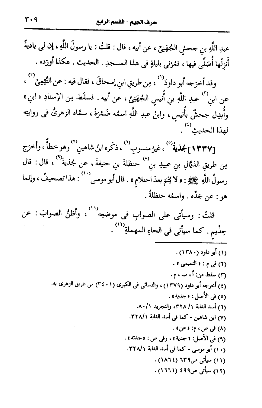 ذَكَرَهُ ابن شَاهِين وهو خطأ وأخرج من طريق الذيال بن عبيد، عَن حنظلة بن حنيفة، عَن جذية قال: قال رَسُولُ اللهِ صَلى الله عَلَيه وسَلم لا يتم بعد احتلام.