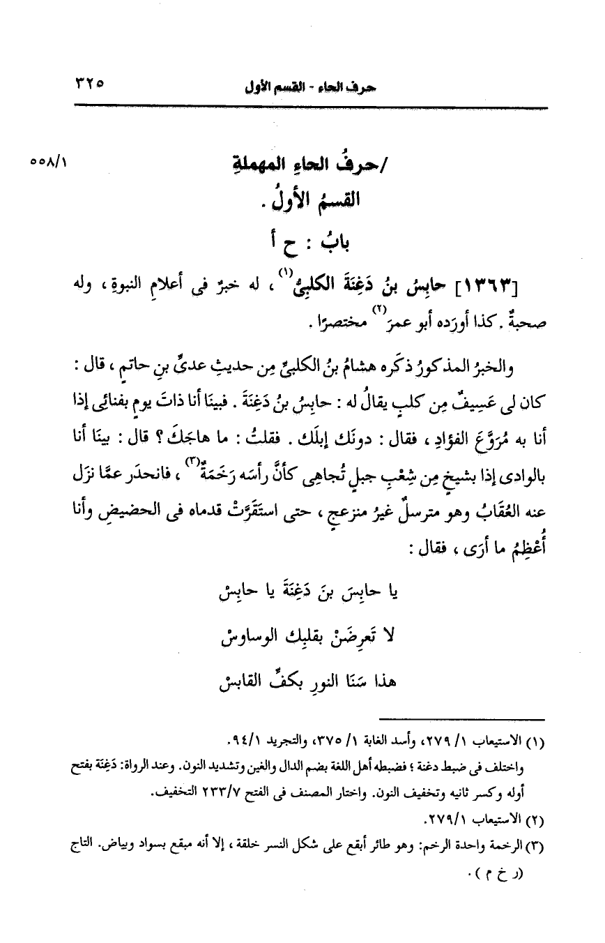 والخبر المذكور ذكره هشام بن الكلبي من حديث عدي بن حاتم، قال: كان لي عسيف من كلب يُقَالُ لَهُ: حابس بن دغنة فبينما أنا ذات يوم بفنائي إذا أنا به مروع الفؤاد فقال دونك إبلك فقلت ما هاجك قال بينما أنا بالوادي إذا بشيخ من شعب جبل تجاهى كأن رأسه رخمة فانحدر عما نزل عنه العقاب وهو مترسل غير منزعج حتى استقرت قدماه في الحضيض وأنا أعظم ما أرى فقال: