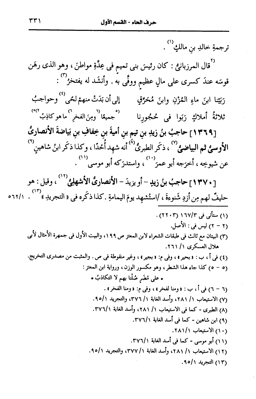 1369- حاجب بن زيد بن تيم بن أُمَيَّة بن خفاف بن بياضة، الأَنصارِيّ الأوسي ثم البياضي.