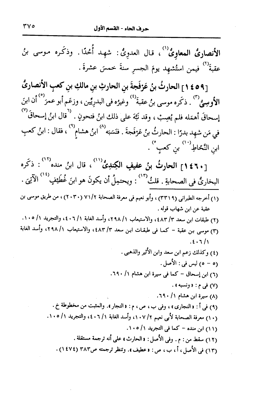 1459- الحارث بن عرفجة بن الحارث بن مالك بن كعب، الأَنصارِيّ الأوسي.
