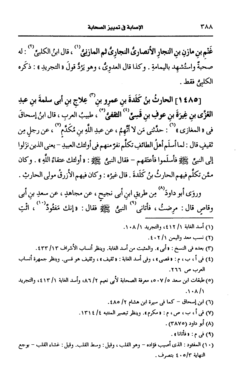 1485- الحارث بن كلدة بن عَمرو بن أبي علاج بن أبي سلمة بن عبد العزى بن غيرة بن عوف بن قصي الثَّقفي طبيب العرب.
