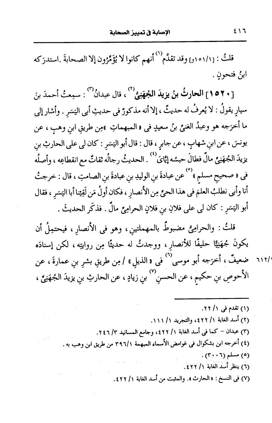 قال عبدان سمعت أَحمد بن سيار يقول لا يعرف له حديث الا أنه مذكور في حديث أبي اليسر وأشار إلى ما أَخرجه هو وعبد الغني بن سعيد في المبهمات من طريق ابن وهب، عَن يونس، عَن ابن شهاب عن جابر قال قال أَبو اليسر، وكان لي على الحارث بن يزيد الجهني مال فطال حبسه اياي الحديث. رجاله ثقات مع انقطاعه وأصله في صحيح مسلم، عَن عبادة بن الوليد بن عبادة بن الصامت قال خرجت أنا وأبي نطلب العلم في هذا الحي من الأنصار فكان أول من لقينا أبا اليسر فقال أَبو اليسر كان لي على فلان بن فلان الحرامي مال فذكر الحديث.
