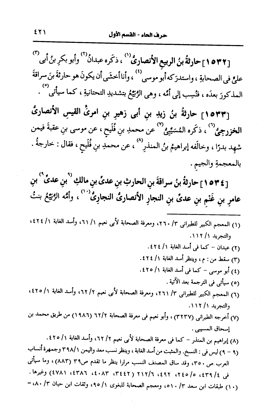 1534- حارثة بن سراقة بن الحارث بن عَدِيّ بن مالك بن عامر بن غنم بن عَدِيّ بن النجار، الأَنصارِيّ النجاري وأمه الربيع بنت النضر عمه أنس بن مالك.