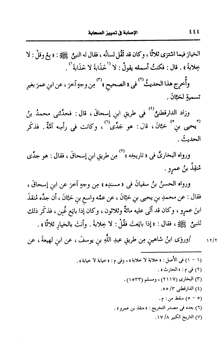 ورواه الحسن بن سفيان في مسنده من وجه آخر، عَن ابن إسحاق فقال، عَن محمد بن يحيى بن حبان، عَن عمه واسع بن حبان أن جده منقذ بن عَمرو كان قد أتى عليه مِئَة وثلاثون، وكان إذا بايع غبن فذكر ذلك للنبي صَلى الله عَلَيه وسَلم فقال إذا بايعت فقل لا خلابة وأنت بالخيار ثلاثا.