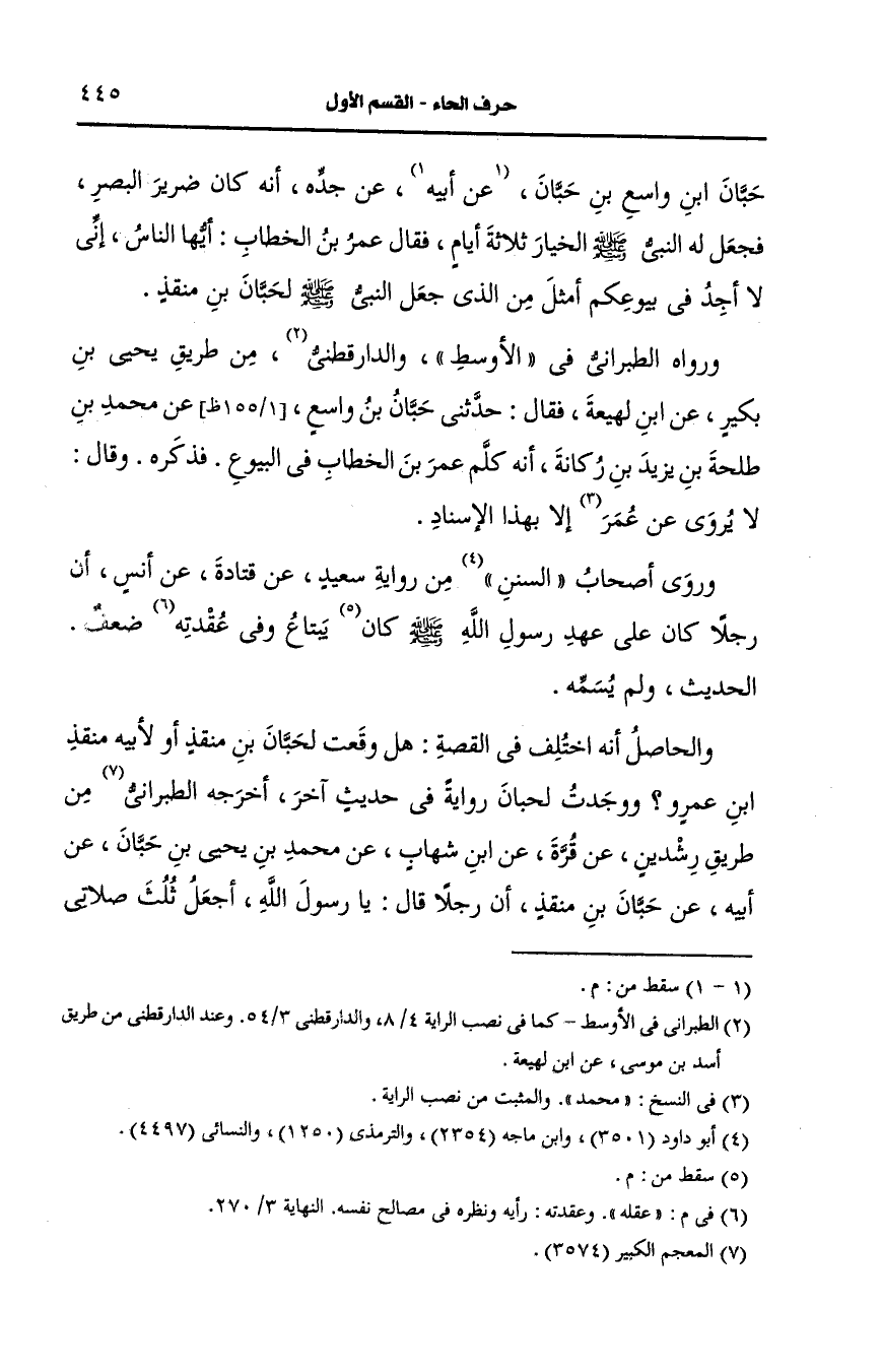ورواه الطَّبَرَانِيُّ في الأوسط والدار قطني من طريق يحيى بن بكير، عَن ابن لهيعة فقال حدثني حبان بن واسع، عَن محمد بن طلحة بن يزيد بن ركانة أنه كلم عمر بن الخطاب في البيوع فذكره وقال لا يروى، عَن محمد إلا بهذا الإسناد.