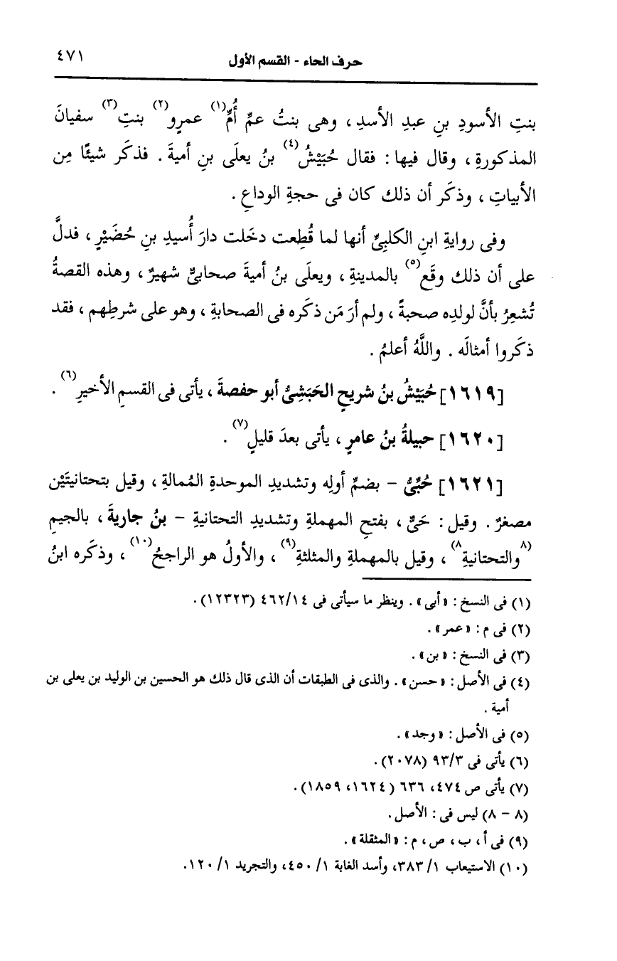 1621- (ز) حبي بضم أوله وتشديد الموحدة الممالة وقيل بتحتانيتين مصغرا وقيل حي بفتح المهملة وتشديد التحتانية بن جاربة بالجيم والتحتانية وقيل بالمهملة والمثقلة والأول هو الراجح.