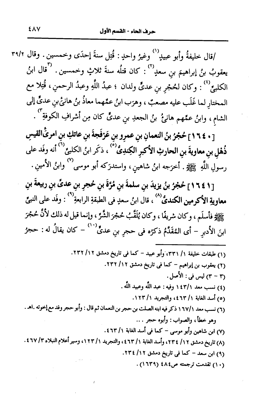 1641- حجر بن يزيد بن سلمة بن مرة بن حجر بن عَدِيّ بن ربيعة بن معاوية الأكرمين الكندي. قال ابن سعد في الطبقة الرابعة وفد على النَّبِيِّ صَلى الله عَلَيه وسَلم فأسلم، وكان شريفا، وكان يلقب حجر الشر وإنما قيل له ذلك لأن حجر بن الأدبر أي المتقدم ذكره في حجر بن عَدِيّ كان يُقَالُ لَهُ: حجر الخير فأرادوا تمييزهما.