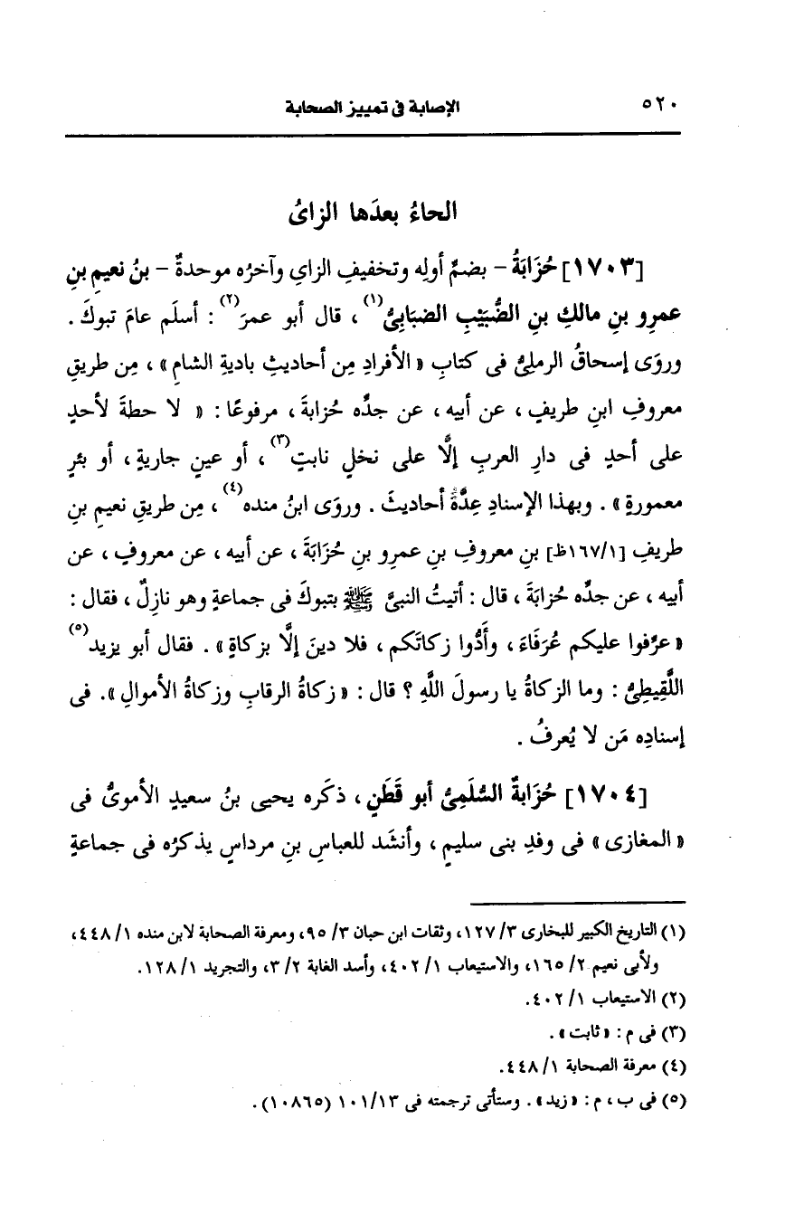 1703- حزابة بضم أوله وتخفيف الزاي وآخره موحدة بن نعيم بن عَمرو بن مالك بن الضبيب الضبابي.
