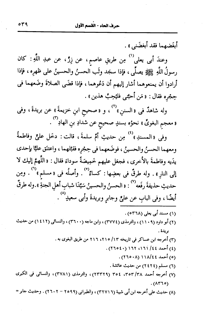 وعند أبي يعلي من طريق عاصم، عَن زر، عَن عَبد الله كان رسول الله صَلى الله عَلَيه وسَلم يصلي فإذا سجد وثب الحسن والحسين على ظهره فإذا أرادوا أن يمنعوهما أشار إليهم أن دعوهما فإذا قضى الصلاة وضعهما في حجره، فقال: من أحبني فليحب هذين.