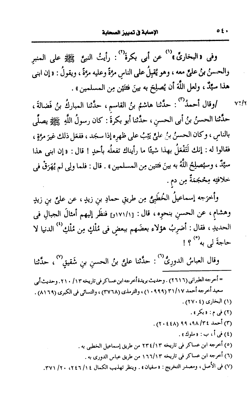 وفي البُخارِيّ، عَن أبي بكر رأيت النَّبيّ صَلى الله عَلَيه وسَلم على المنبر والحسن بن علي معه وهو يقبل على الناس مرة وعليه مرة ويقول إن ابني هذا سيد ولعل الله أن يصلح به بين فئتين من المسلمين.