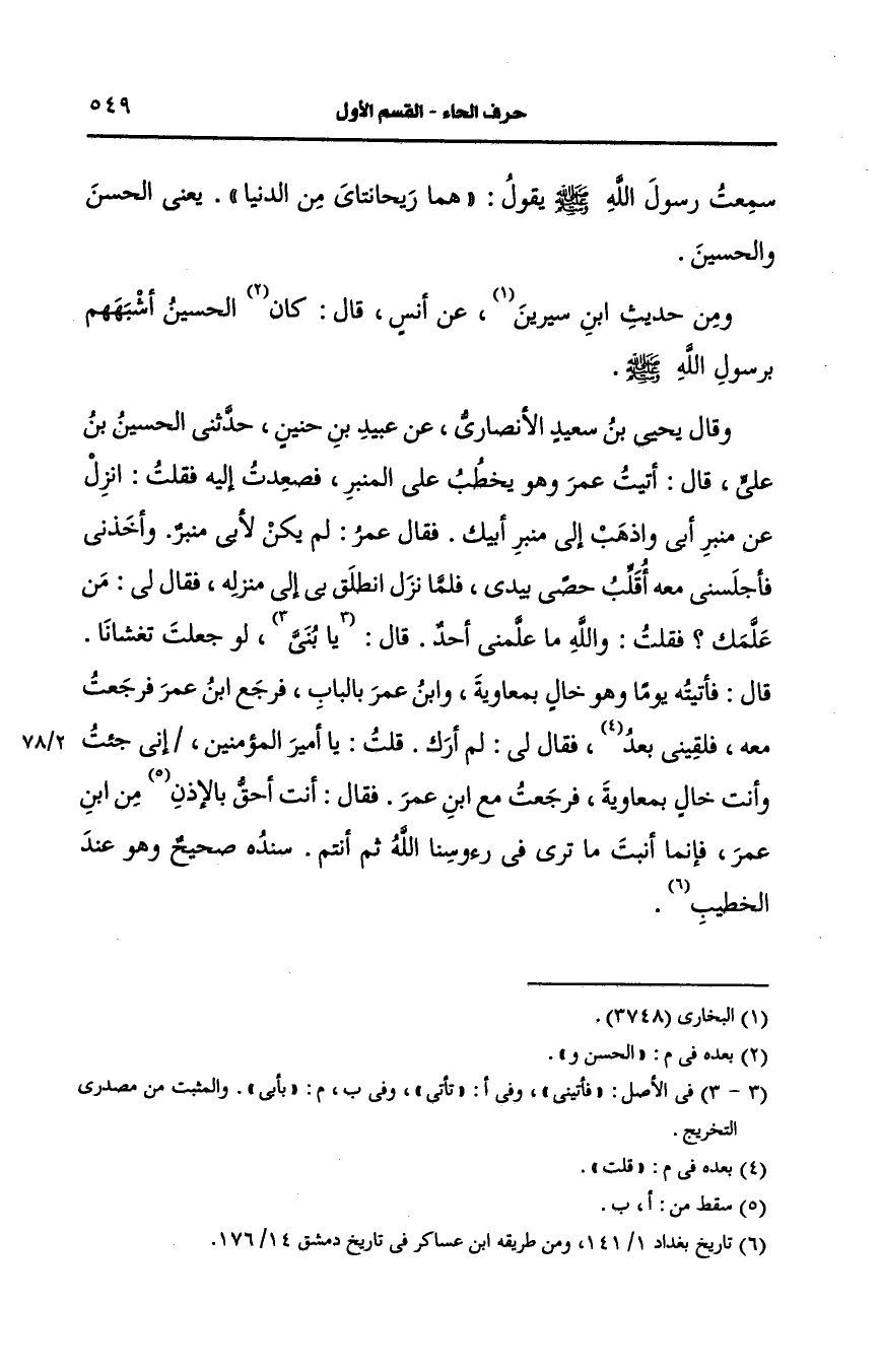 وقال يحيى بن سعيد، الأَنصارِيّ، عَن عبيد بن حنين حدثني الحسين بن علي، قال: أَتيتُ عمر وهو يخطب على المنبر فصعدت إليه فقلت انزل، عَن منبر أبي واذهب إلى منبر أبيك فقال عمر لم يكن لأبي منبر وأخذني فأجلسني معه أقلب حصى بيدي فلما نزل انطلق بي إلى منزله فقال لي من علمك قلت: والله ما علمني أحد قال بأبي لو جعلت تغشانا قال فأتيته يوما وهو خال بمعاوية، وابن عمر بالباب فرجع بن عمر فرجعت معه فلقيني بعد قلت: فقال لي لم أرك قلت: يا أمير المؤمنين إني جئت وأنت خال بمعاوية فرجعت مع بن عمر فقال أنت أحق بالإذن من بن عمر فإنما أنبت ما ترى في رؤوسنا الله ثم أنتم سنده صحيح وهو عند الخطيب.