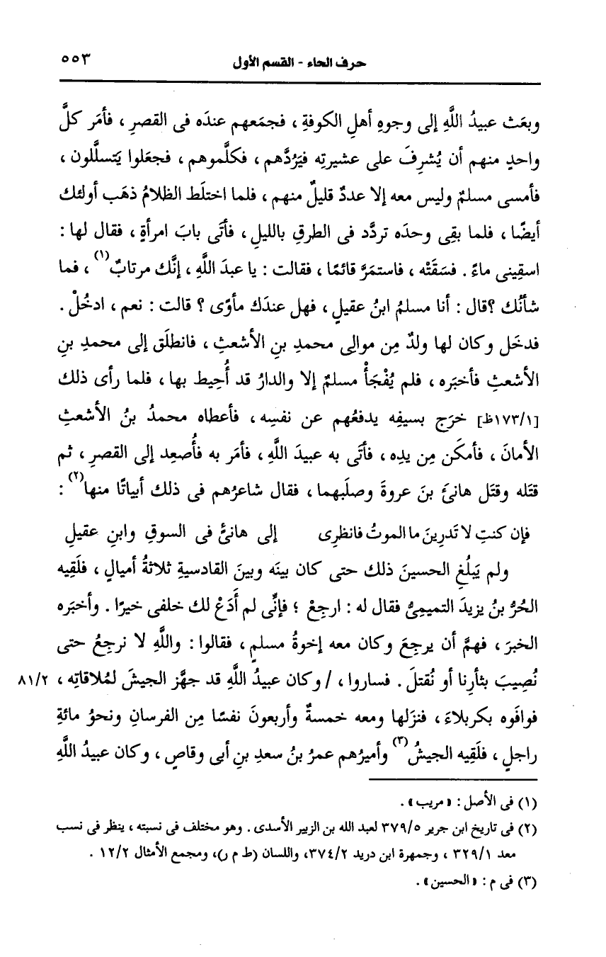 ولم يبلغ الحسين ذلك حتى كان بينه وبين القادسية ثلاثة أميال فلقيه الحر بن يزيد التميمي فقال له ارجع فإني لم أدع لك خلفي خيرا وأخبره الخبر فهم أن يرجع، وكان معه إخوة مسلم فقالوا والله لا نرجع حتى نصيب بثأرنا أو نقتل فساروا، وكان عبيد الله قد جهز الجيش لملاقاته فوافوه بكربلاء فنزلها ومعه خمسة وأربعون نفسا من الفرسان ونحو مِئَة راجل فلقيه الحسين وأميرهم عمر ابن سَعد بن أبي وقاص، وكان عبيد الله ولاه الري وكتب له بعهده عليها إذا رجع من حرب الحسين فلما التقيا قال له الحسين اختر مني إحدى ثلاث إما أن ألحق بثغر من الثغور وإما أن أرجع إلى المدينة وإما أن أضع يدي في يد يزيد بن معاوية.