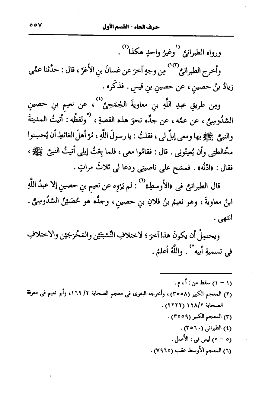 قال الطَّبَرَانِيُّ: في الأوسط لم يروه، عَن نعيم بن حصين إلا عَبد الله بن معاوية وهو نعيم بن فلان بن حصين وجده هو حصين السدوسي انتهى ويحتمل أن يكون هذا آخر لاختلاف النسبتين والمخرجين والاختلاف في تسمية أَبيه فالله أعلم.