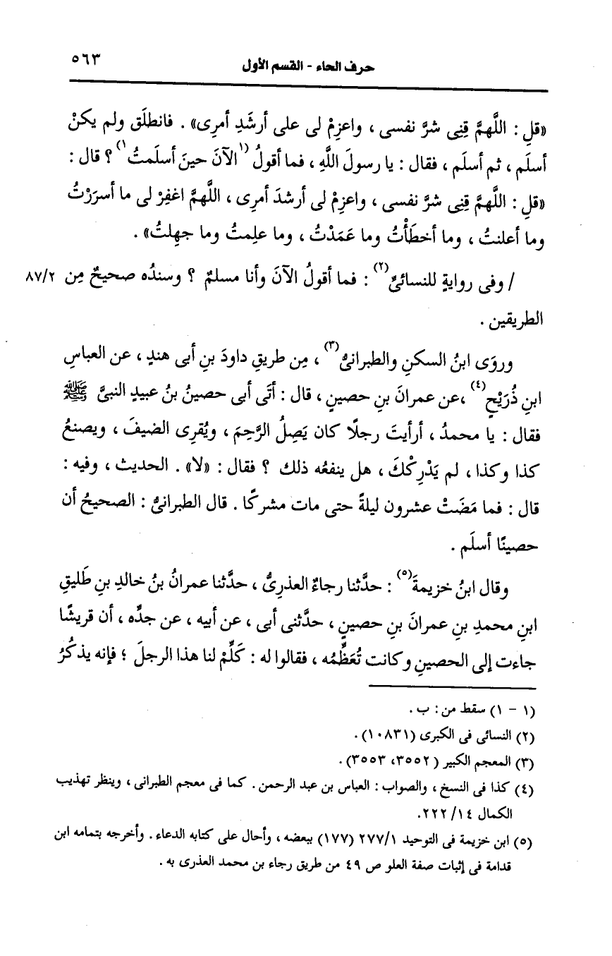 وقال ابن خزيمة، حَدَّثنا رجاء العذري، حَدَّثنا عمران بن خالد بن طليق بن محمد بن عمران بن حصين حدثني أبي، عَن أَبيه، عَن جَدِّه أن قريشا جاءت إلى الحصين وكانت تعظمه فقالوا له كلم لنا هذا الرجل فإنه يذكر آلهتنا ويسبهم.
