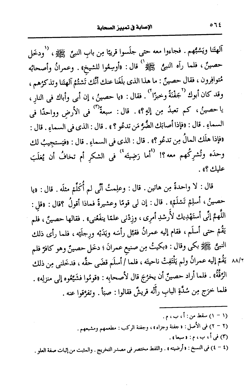 فجاؤُوا معه حتى جلسوا قريبا من باب النَّبيّ صَلى الله عَلَيه وسَلم فقال أوسعوا للشيخ وعمران وأصحابه متوافرون فقال حصين ما هذا الذي بلغنا عنك إنك تشتم آلهتنا وتذكرهم وقد كان أبوك حصين خيرا فقال يا حصين إن أبي وأباك في النار يا حصين كم تعبد من إله قال سبعا في الأرض وواحدا في السماء قال فإذا أصابك الضر من تدعو قال الذي في السماء قال فإذا هلك المال من تدعو قال الذي في السماء قال فيستجيب لك وحده وتشركهم معه أرضيته في الشكر أم تخاف أن يغلب عليك.