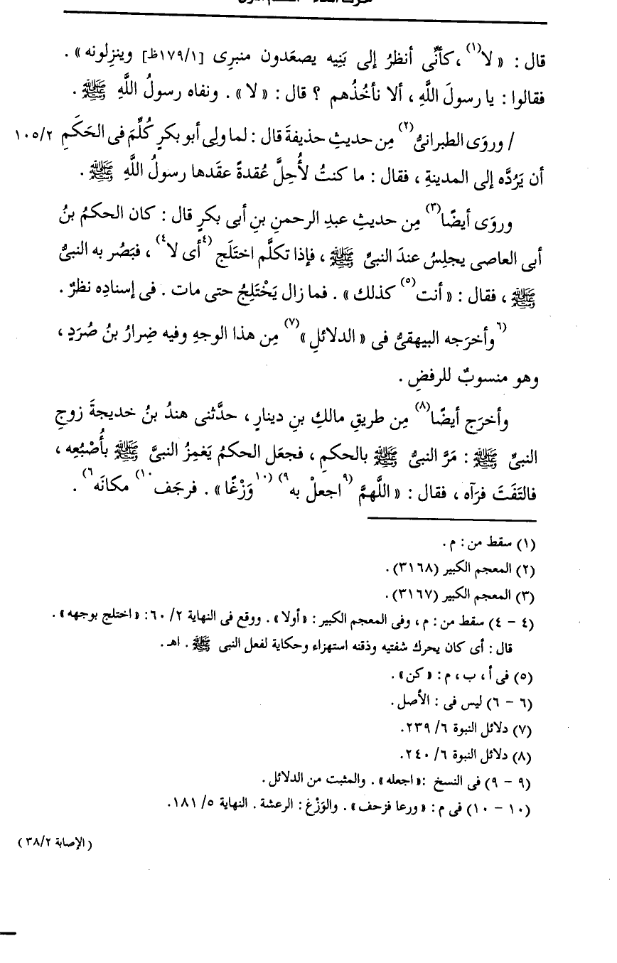 وروى أيضًا من حديث عبد الرحمن بن أبي بكر، قال: كان الحكم بن أبي العاص يجلس عند النَّبيّ صَلى الله عَلَيه وسَلم فإذا تكلم اختلج فبصر به النَّبيّ صَلى الله عَلَيه وسَلم فقال كن كذلك فما زال يختلج حتى مات في إسناده نظر.