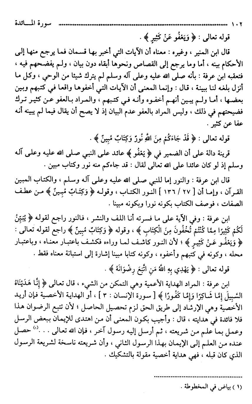 ابن عرفة: وفي الآية على ما فسرته أنا اللف والنشر، فالنور راجع لقوله (يُبَيِّنُ لَكُمْ كَثِيرًا مِمَّا كُنْتُمْ تُخْفُونَ مِنَ الْكِتَابِ)، وقوله (وَكِتَابٌ مُبينٌ) راجع لقوله تعالى: (وَيَعْفُو عَنْ كَثِيرٍ)؛ لأن النور كاشف لما وراءه فكشفَ باعتبار معناه، وباعتبار محله، وكونه في كتبهم وأخفوه، وكونه كتابا مبينا إشارة إلى استبانة معناه فقط.