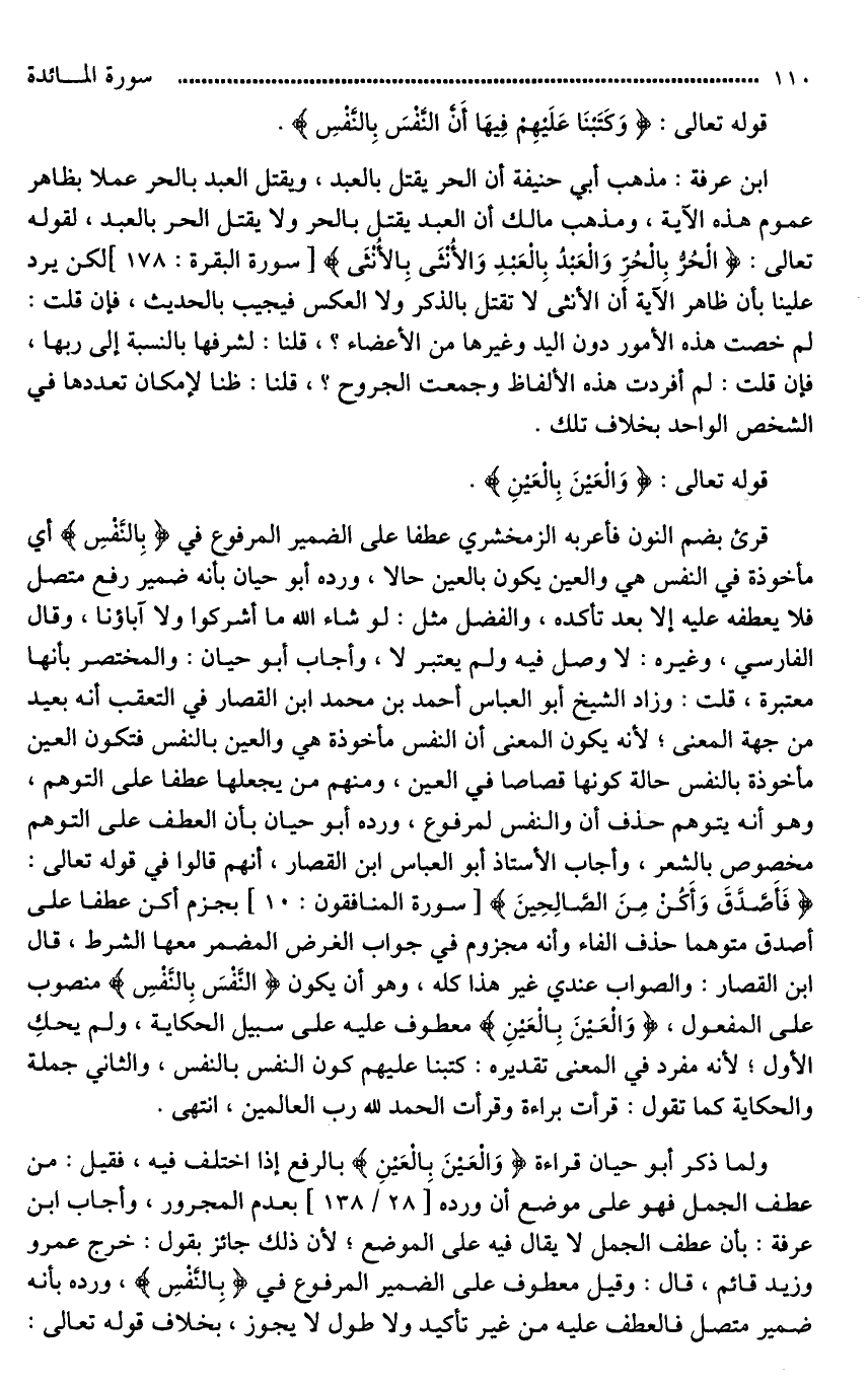 ابن عرفة: مذهب أبي حنيفة أن الحر يقتل بالعبد، ويقتل العبد بالحر عملا بظاهر عموم هذه الآية، ومذهب مالك أن العبد يقتل بالحر ولا يقتل الحر بالعبد، لقوله تعالى: (الْحُرُّ بِالْحُرِّ وَالْعَبْدُ بِالْعَبْدِ وَالْأُنْثَى بِالْأُنْثَى) لكن يرد علينا بأن ظاهر الآية أن الأنثى لَا تقتل بالذكرَ ولا العكس فيجيب بالحديث، فإِن قلت: لم خصت هذه الأمور دون اليد وغيرها من الأعضاء؟، قلنا: لشرفها بالنسبة إلى ربها، فإن قلت: لم أفردت هذه الألفاظ وجمعت الجروح؟، قلنا: ظنا لإمكان تعددها في الشخص الواحد بخلاف تلك.