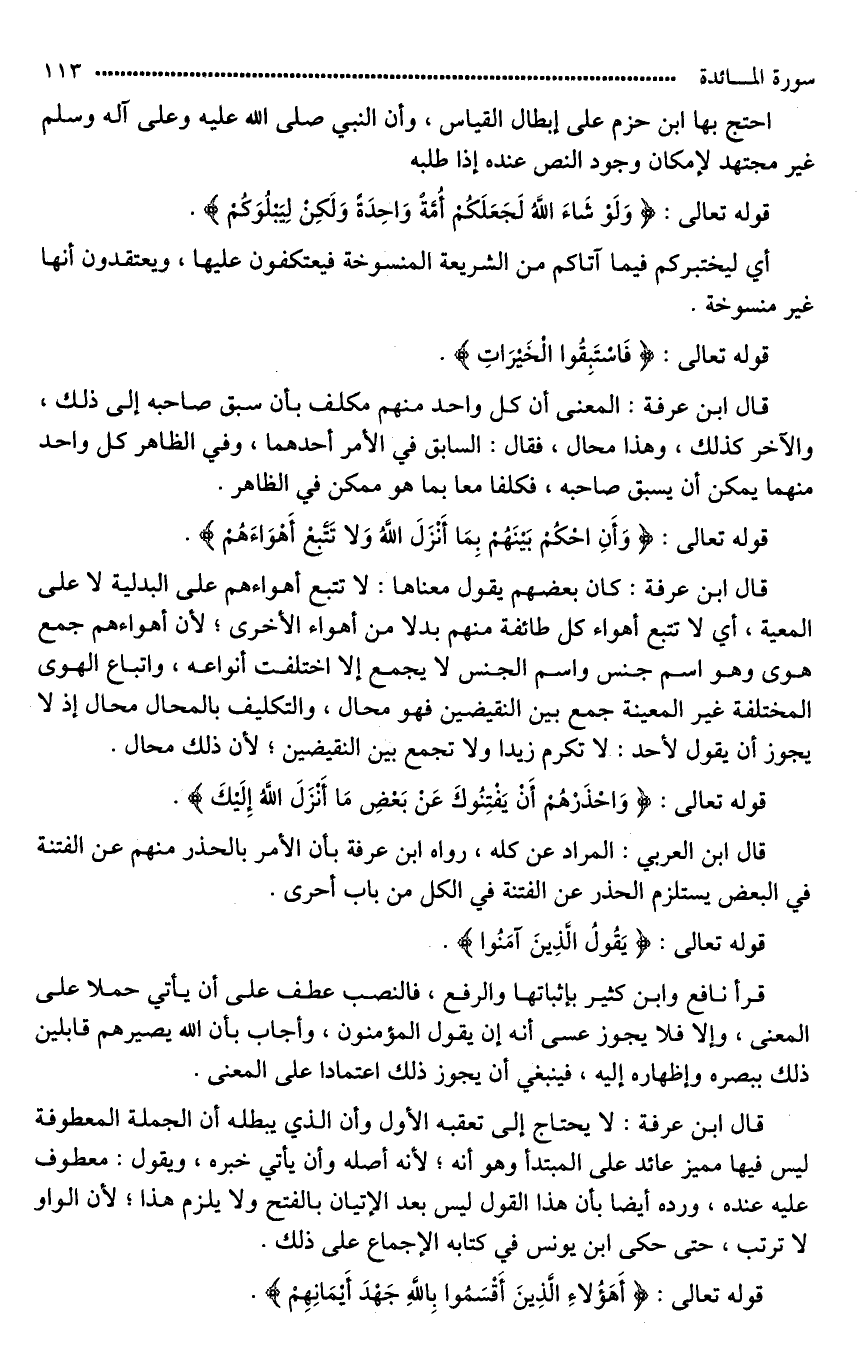 قال ابن عرفة: كان بعضهم يقول معناها: لَا تتبع أهواءهم على البدلية لَا على المعية، أي لَا تتبع أهواء كل طائفة منهم بدلا من أهواء الأخرى. لأن أهواءهم جمع هوى وهو اسم جنس واسم الجنس لَا يجمع إلا اختلفت أنواعه، واتباع الهوى المختلفة غير المعينة جمع بين النقيضين فهو محال، والتكليف بالمحال محال إذ لا يجوز أن يقول لأحد: لَا تكرم زيدا ولا تجمع بين النقيضين؛ لأن ذلك محال.