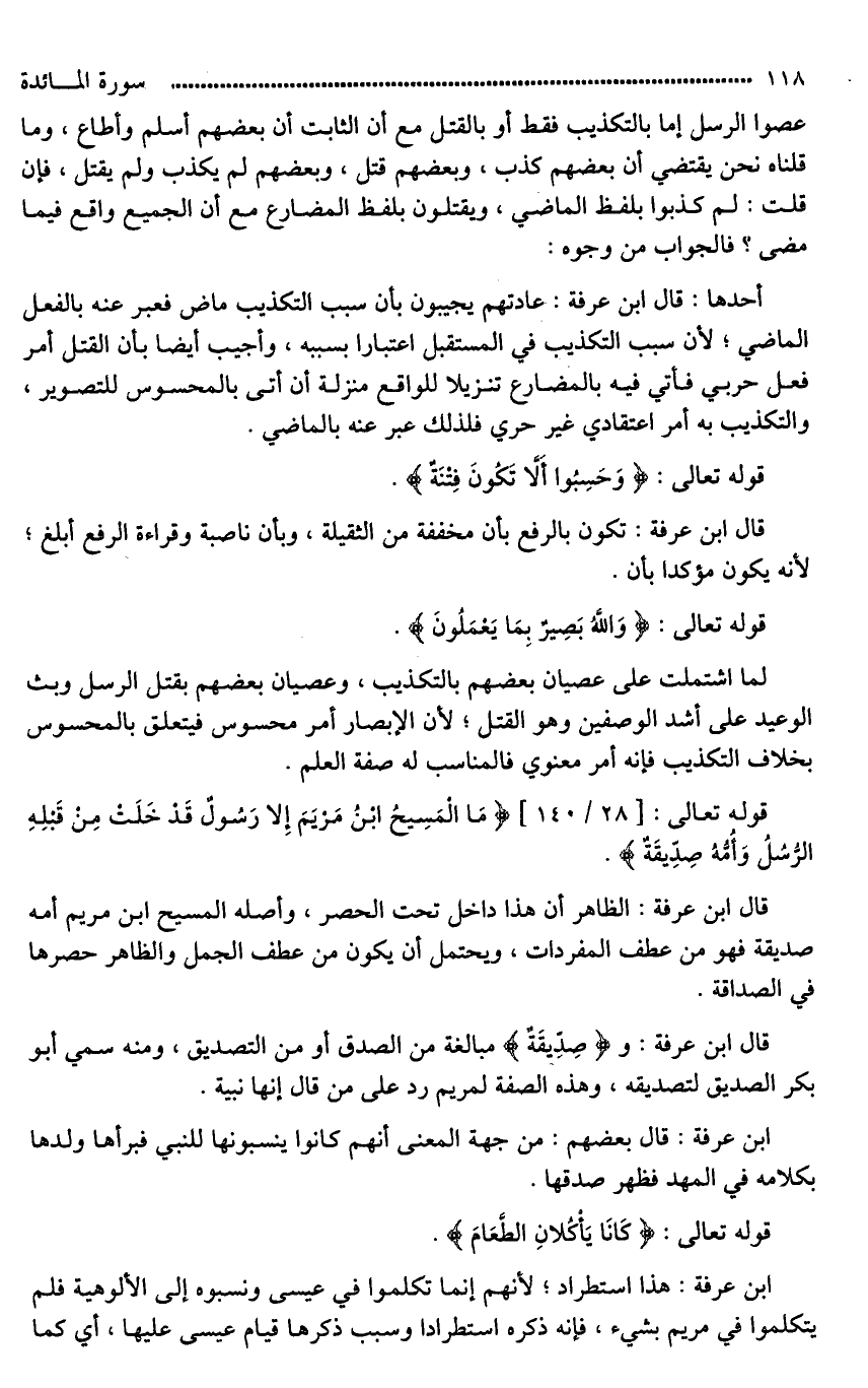 قال ابن عرفة: الظاهر أن هذا داخل تحت الحصر، وأصله المسيح ابن مريم أمه صديقة فهو من عطف المفردات، ويحتمل أن يكون من عطف الجمل والظاهر حصرها في الصداقة.
